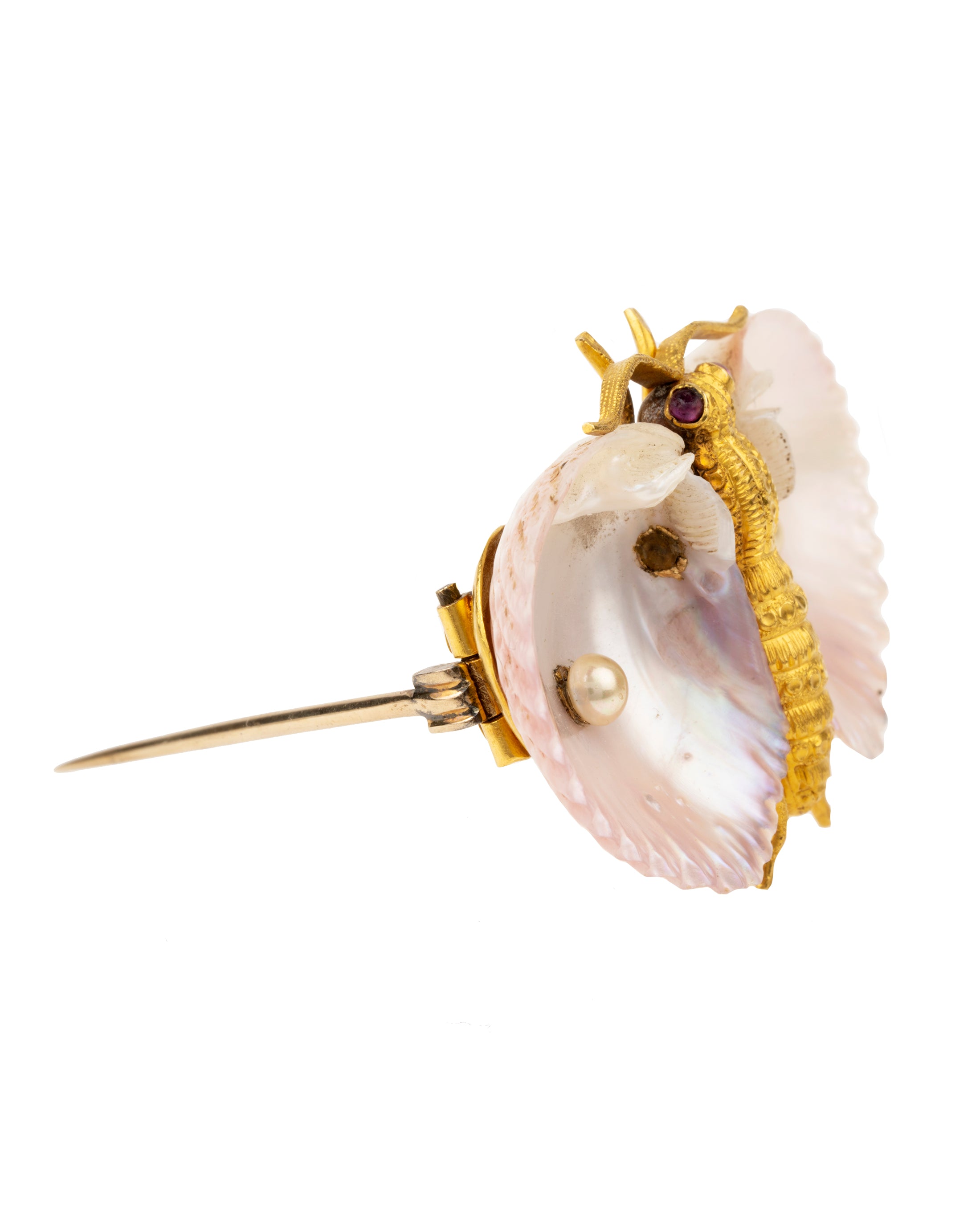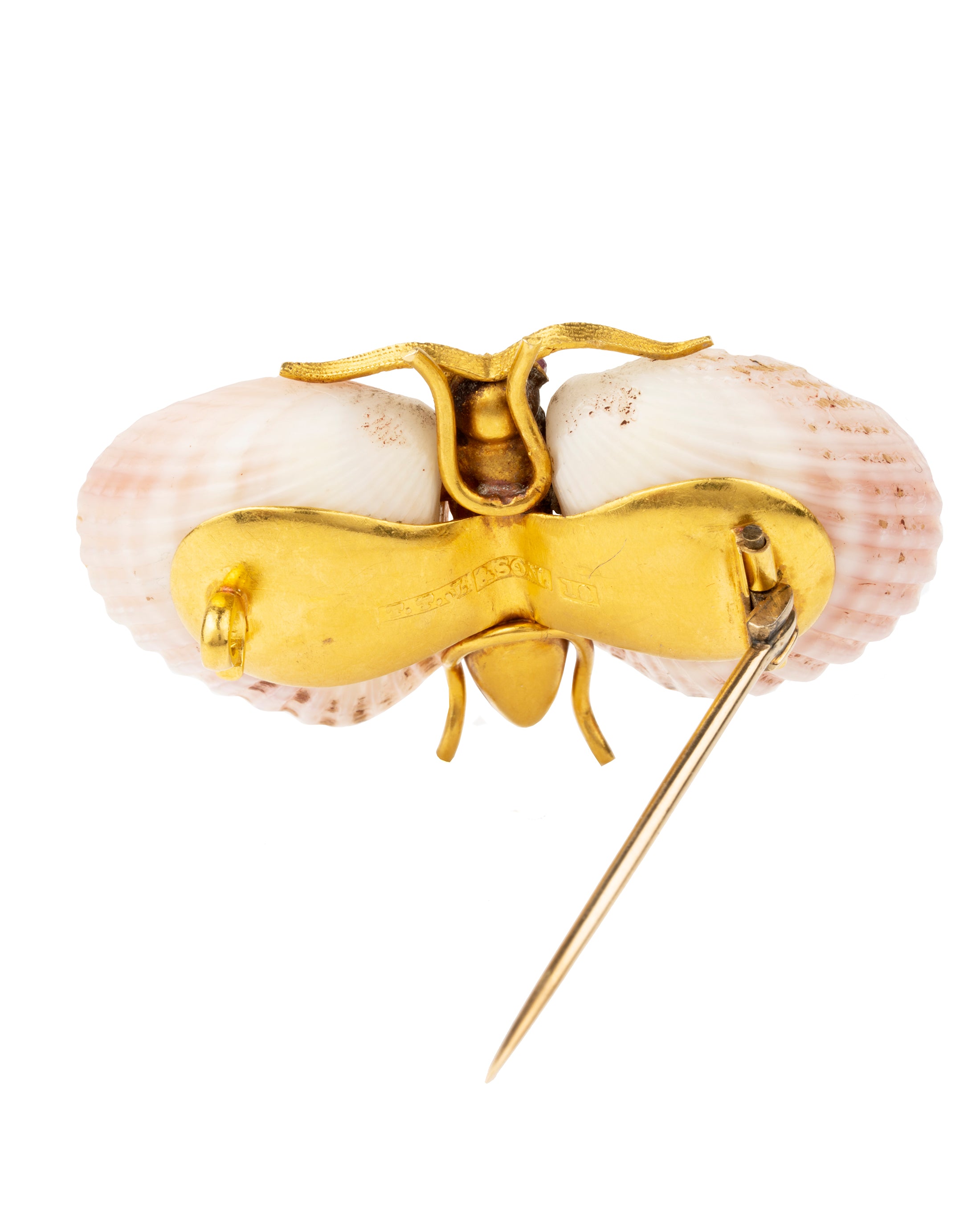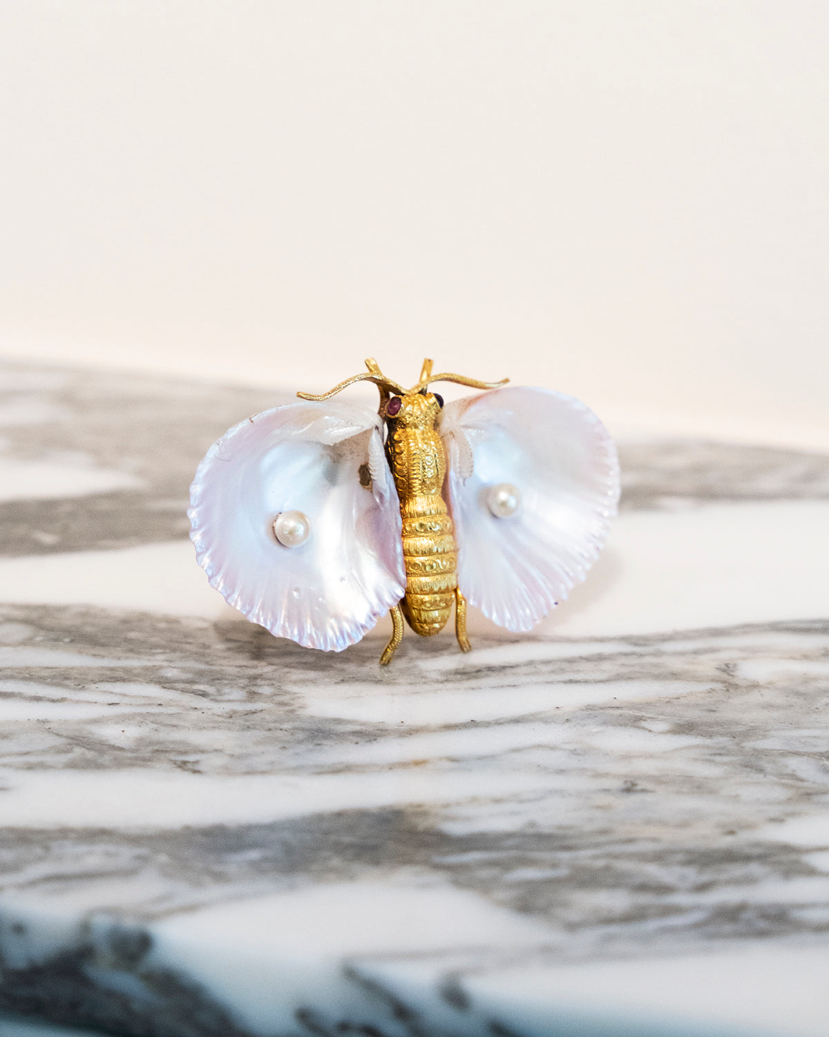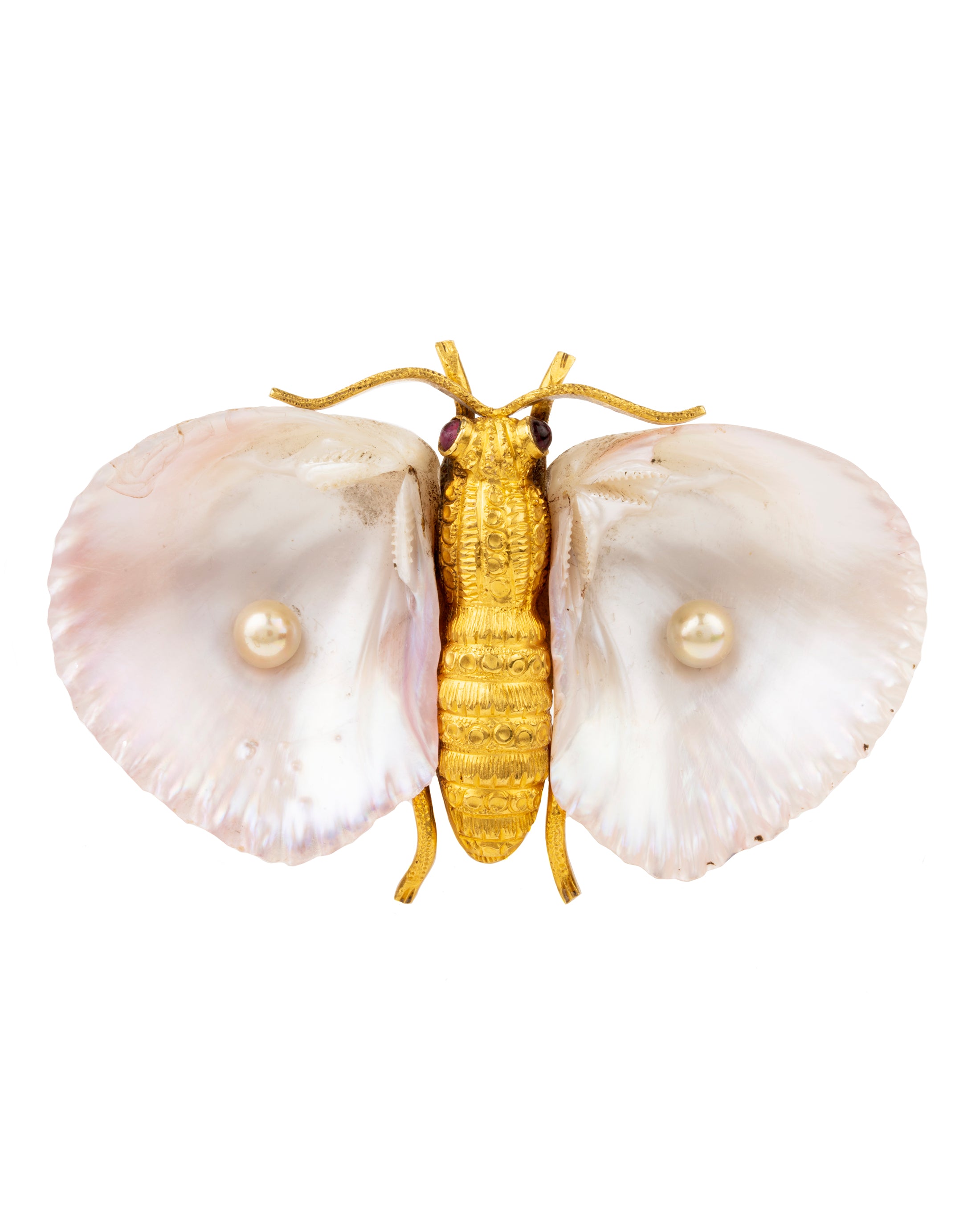 19th Century Butterfly Shell brooch, in 18k gold. Pink and white shells as wings, with pearl details and ruby cabochons for eyes. Hallmarks for TTJ & Son. Australian in origin. Circa 1890.
