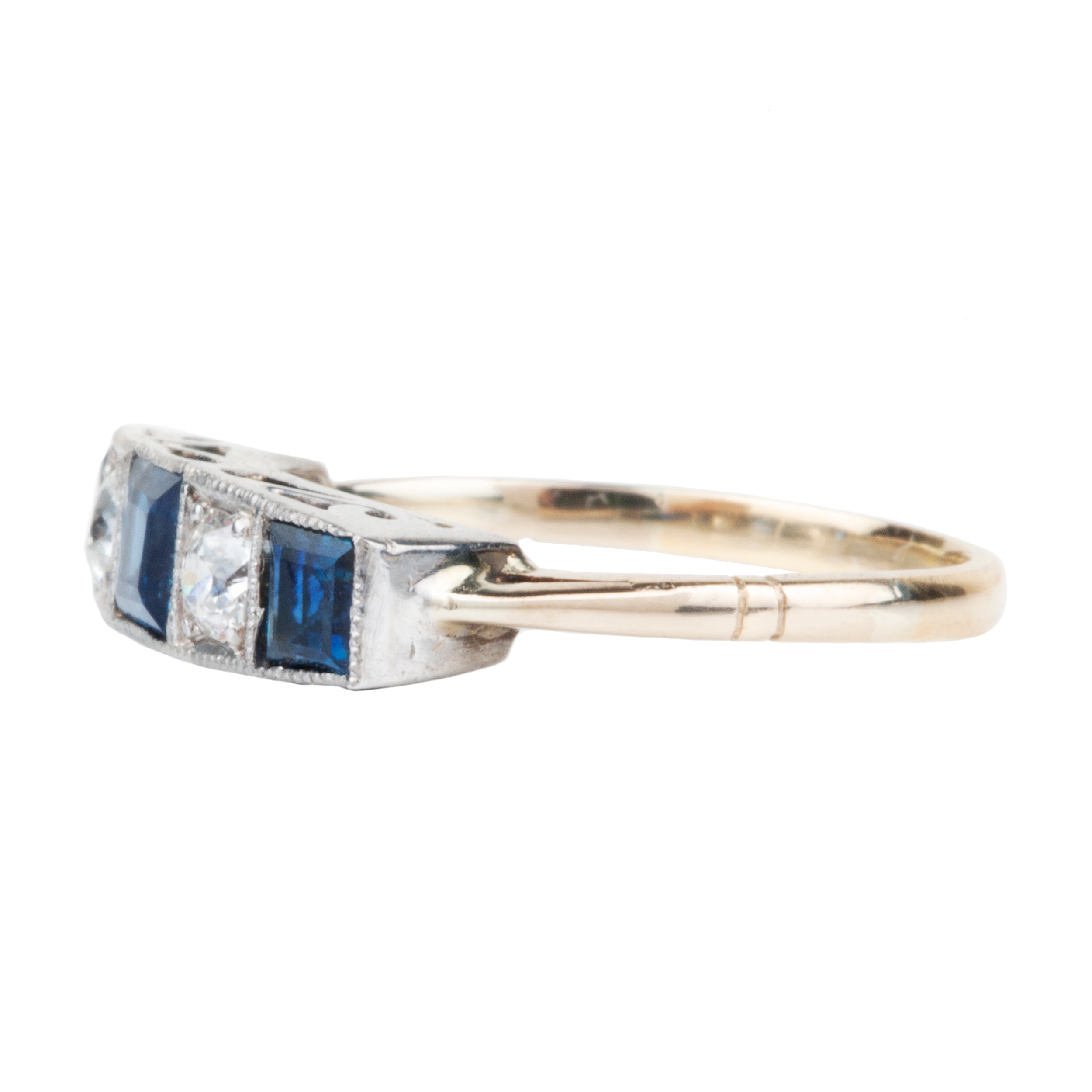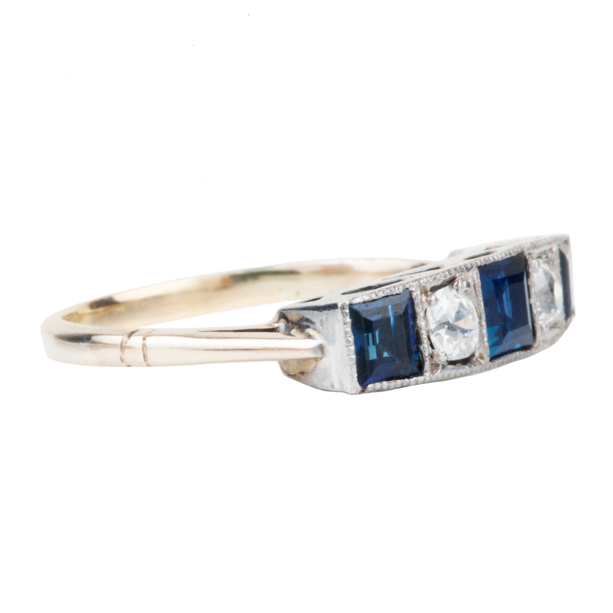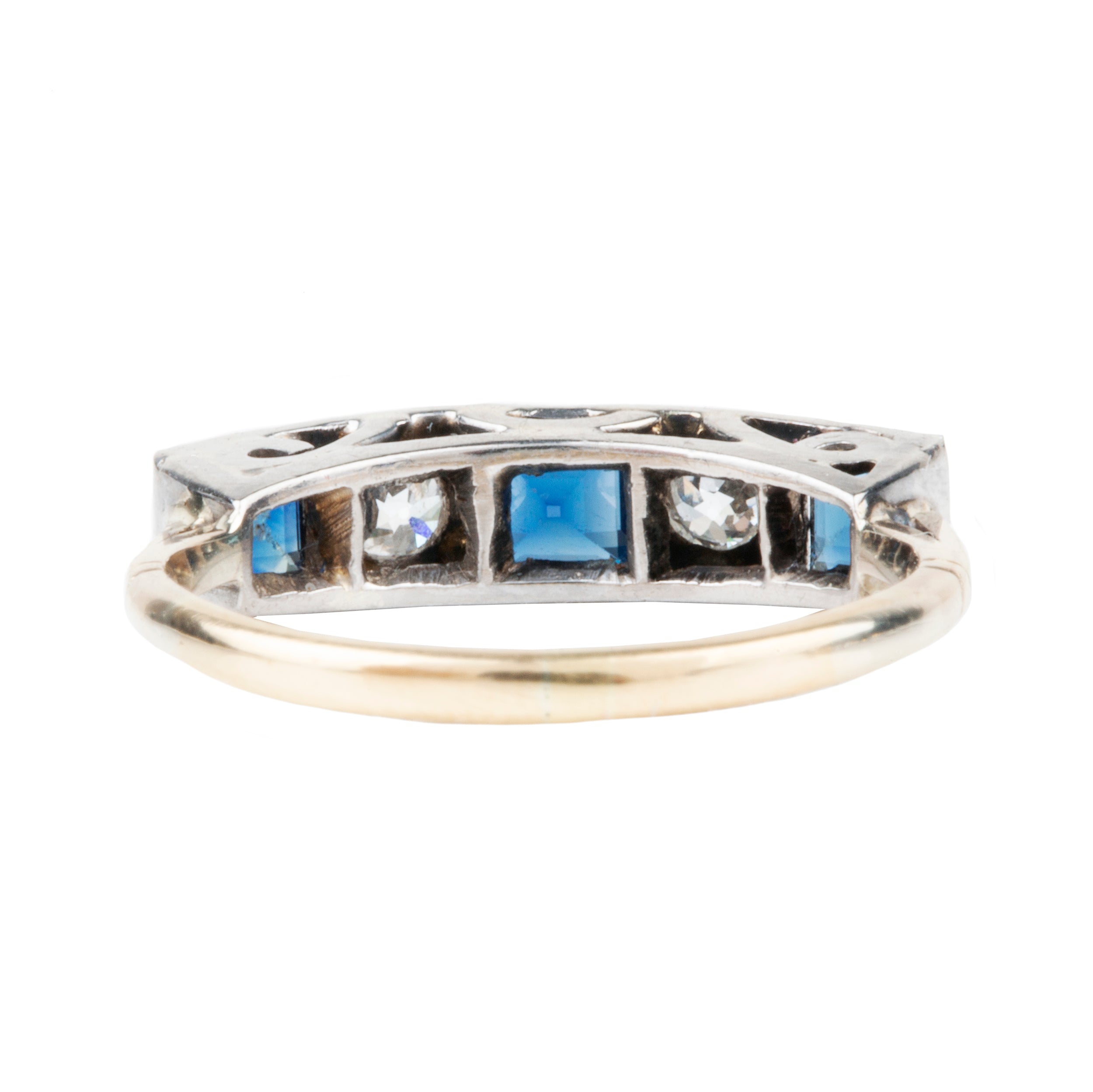 Vintage diamond and sapphire half hoop ring, in platinum and yellow gold. Three step cut sapphires and two old cut diamonds. Great for stacking. English in origin. Mid 20th century.