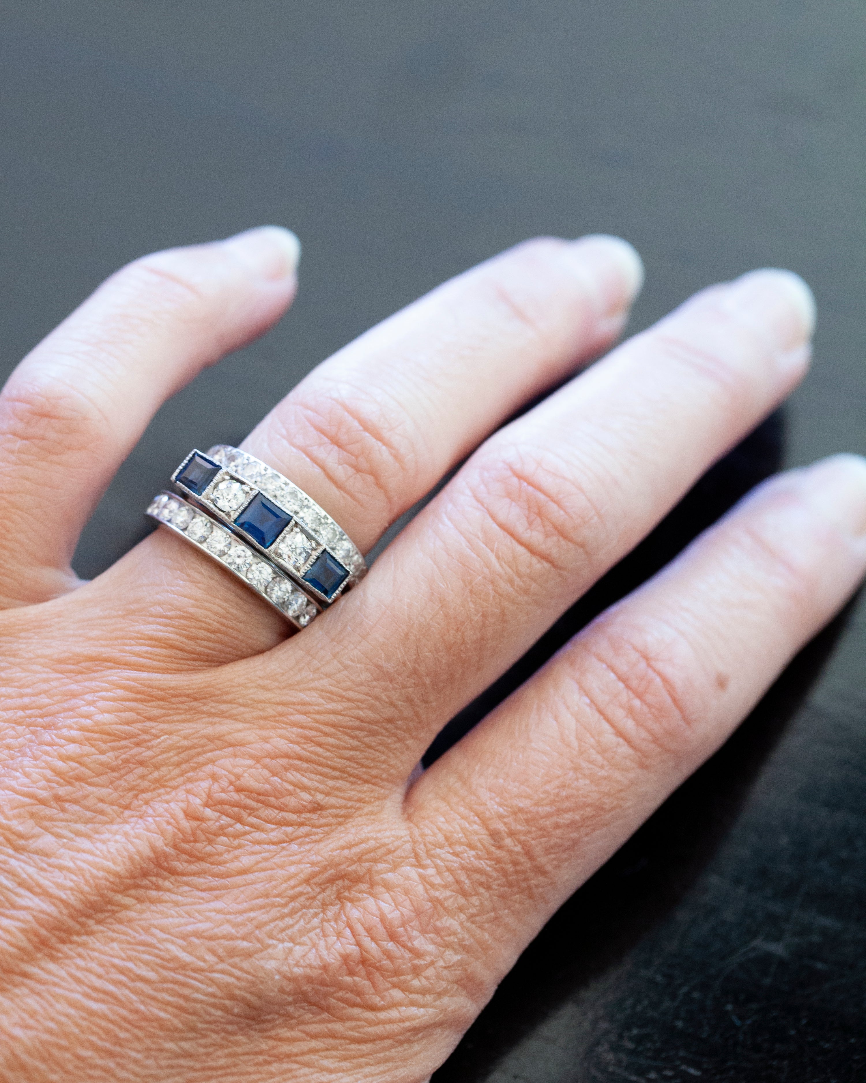 Paired with an Art Deco diamond eternity band and a vintage Harry Winston diamond eternity band.