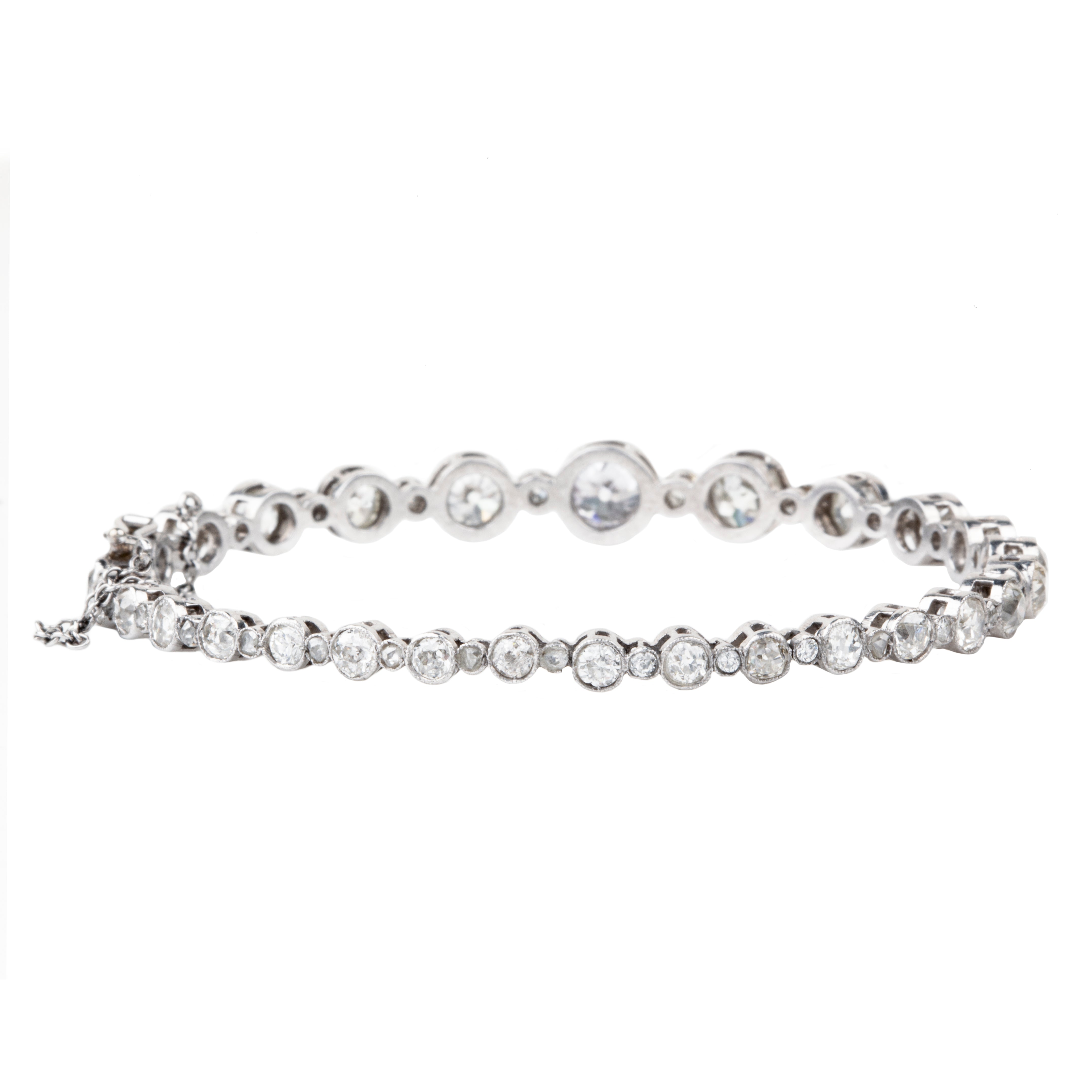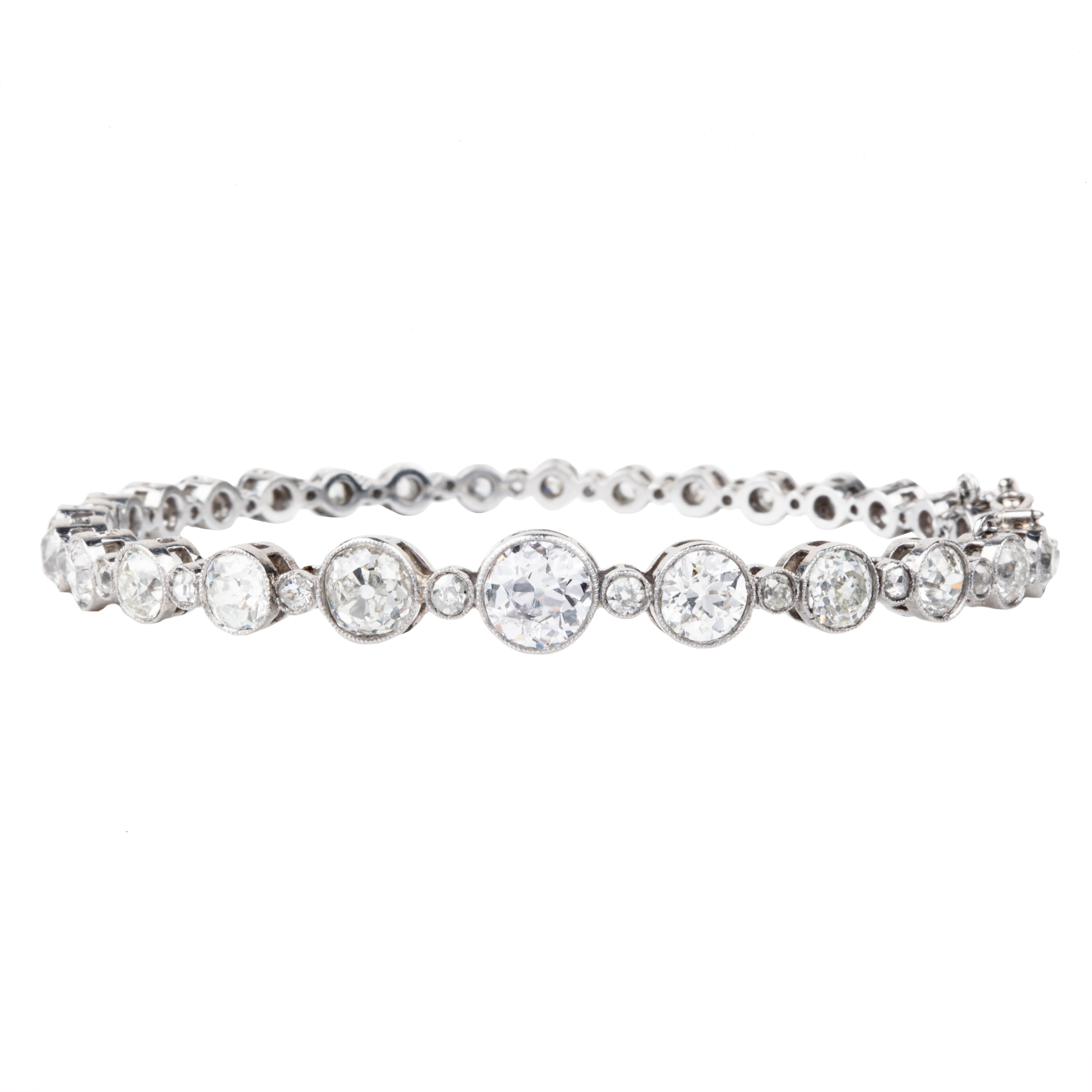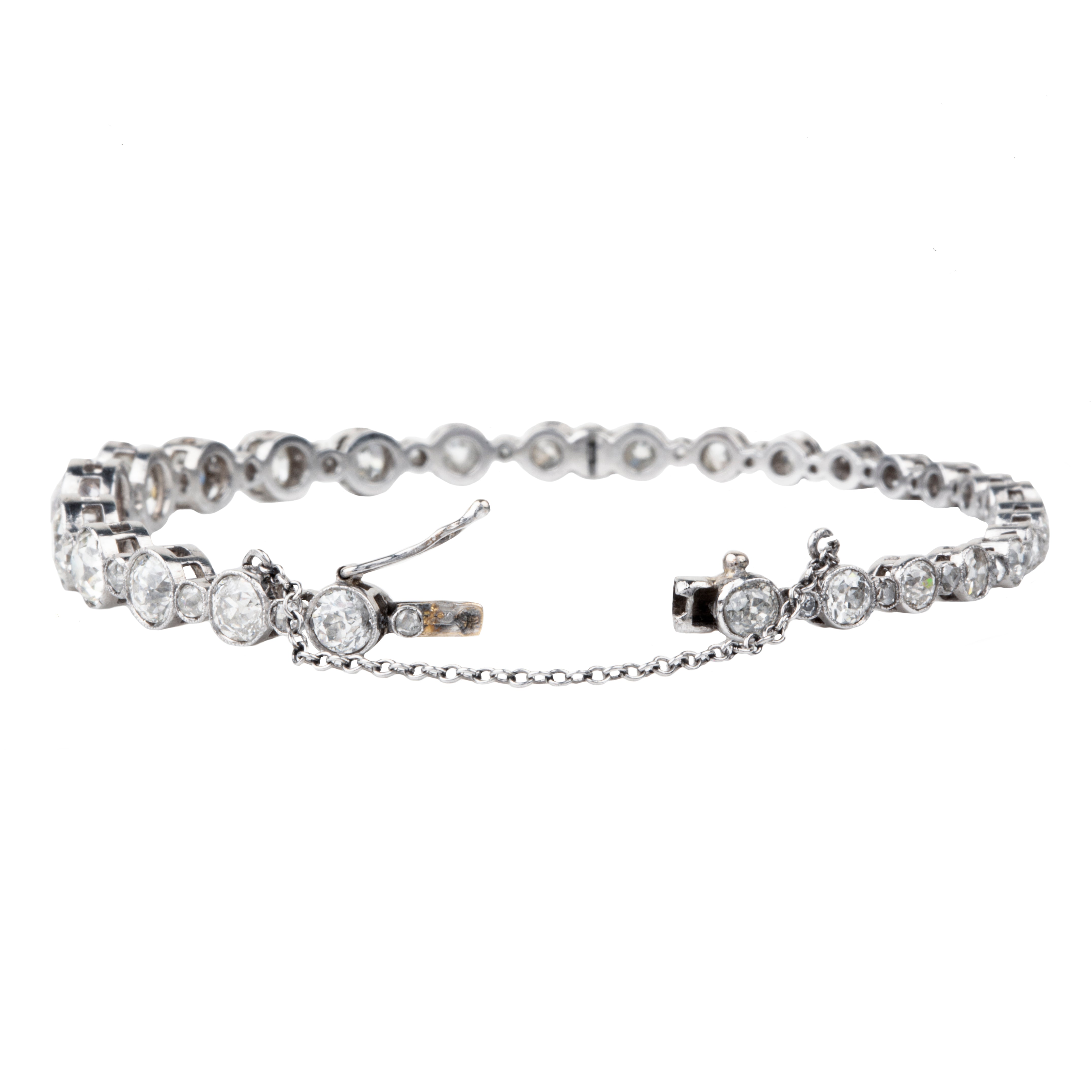Unusual antique diamond bangle bracelet. The bracelet has a mixture of antique old mine and old European cut diamonds, set in platinum. A total of fifty diamonds add up to approximately 8.50 carats in total diamond weight, G/H/I color, and SI1/2 clarity. The center largest diamond is approximately 1.15 carats.
