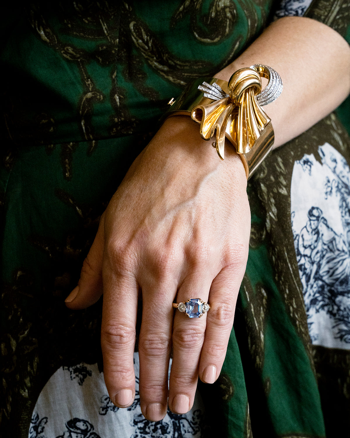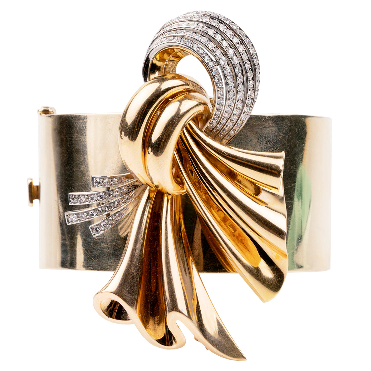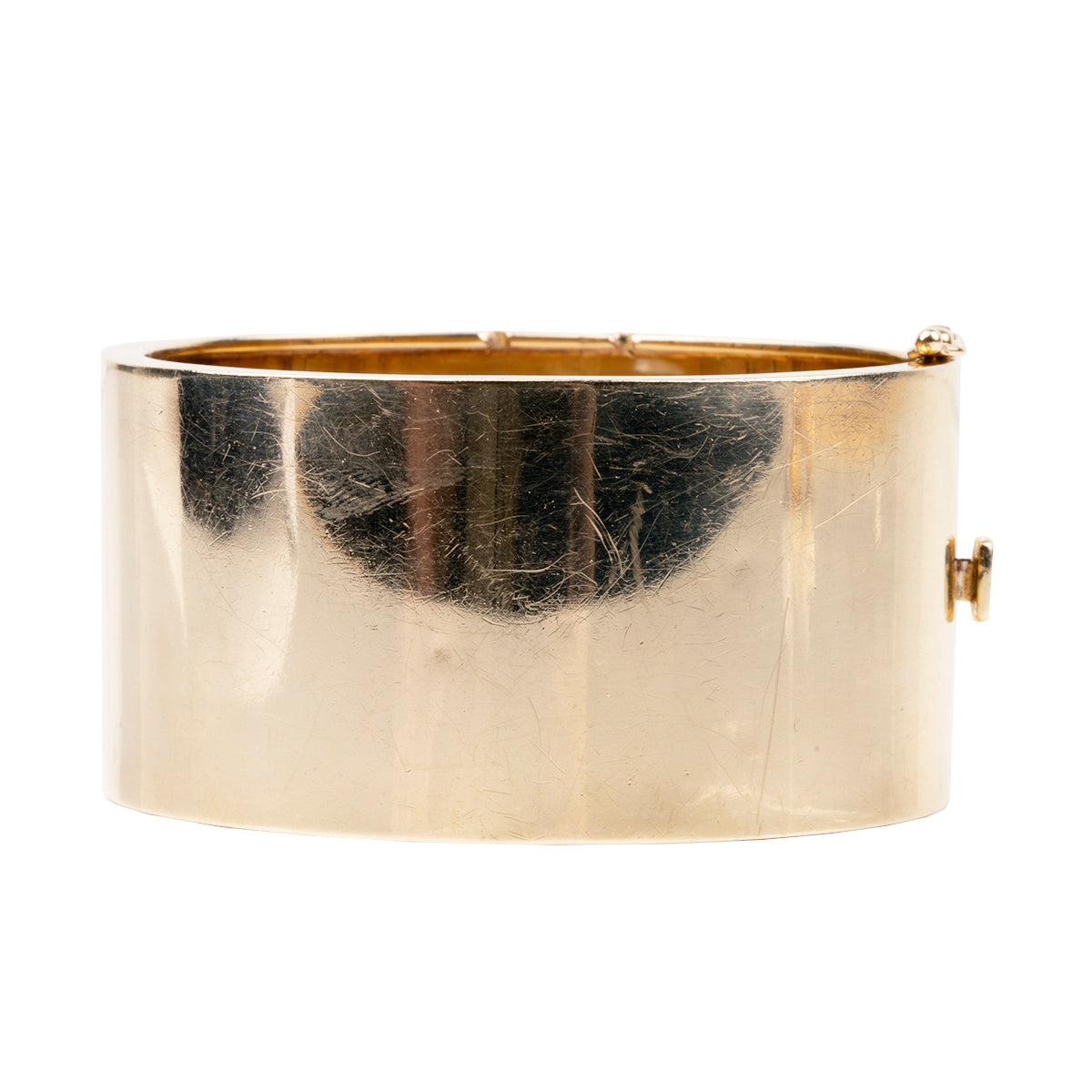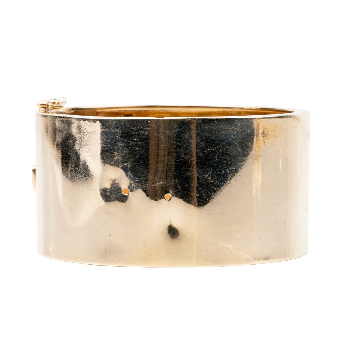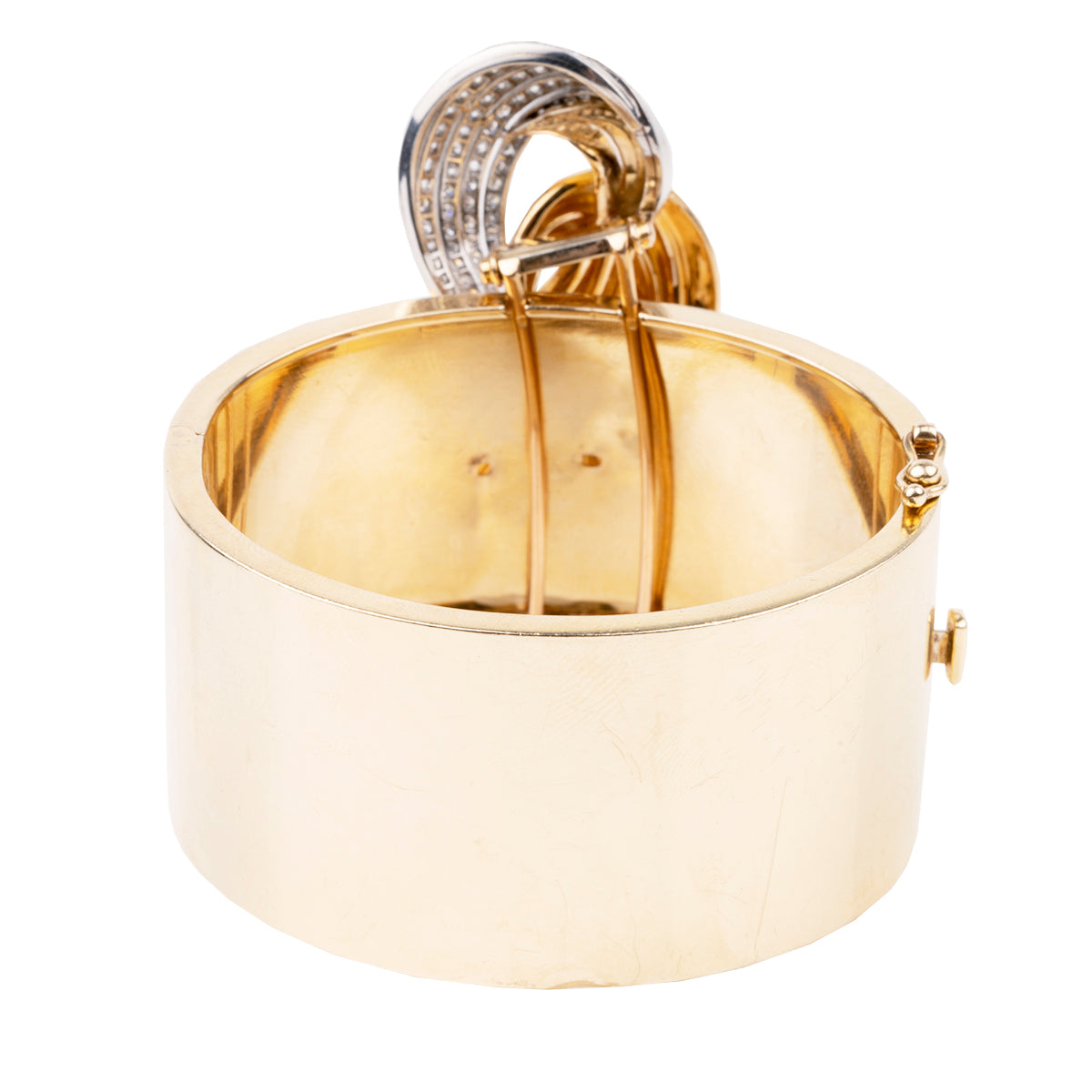 The bangle is 14k yellow gold and appears to be made at a later time to accommodate the dress clip. The bangle can also be worn independently.