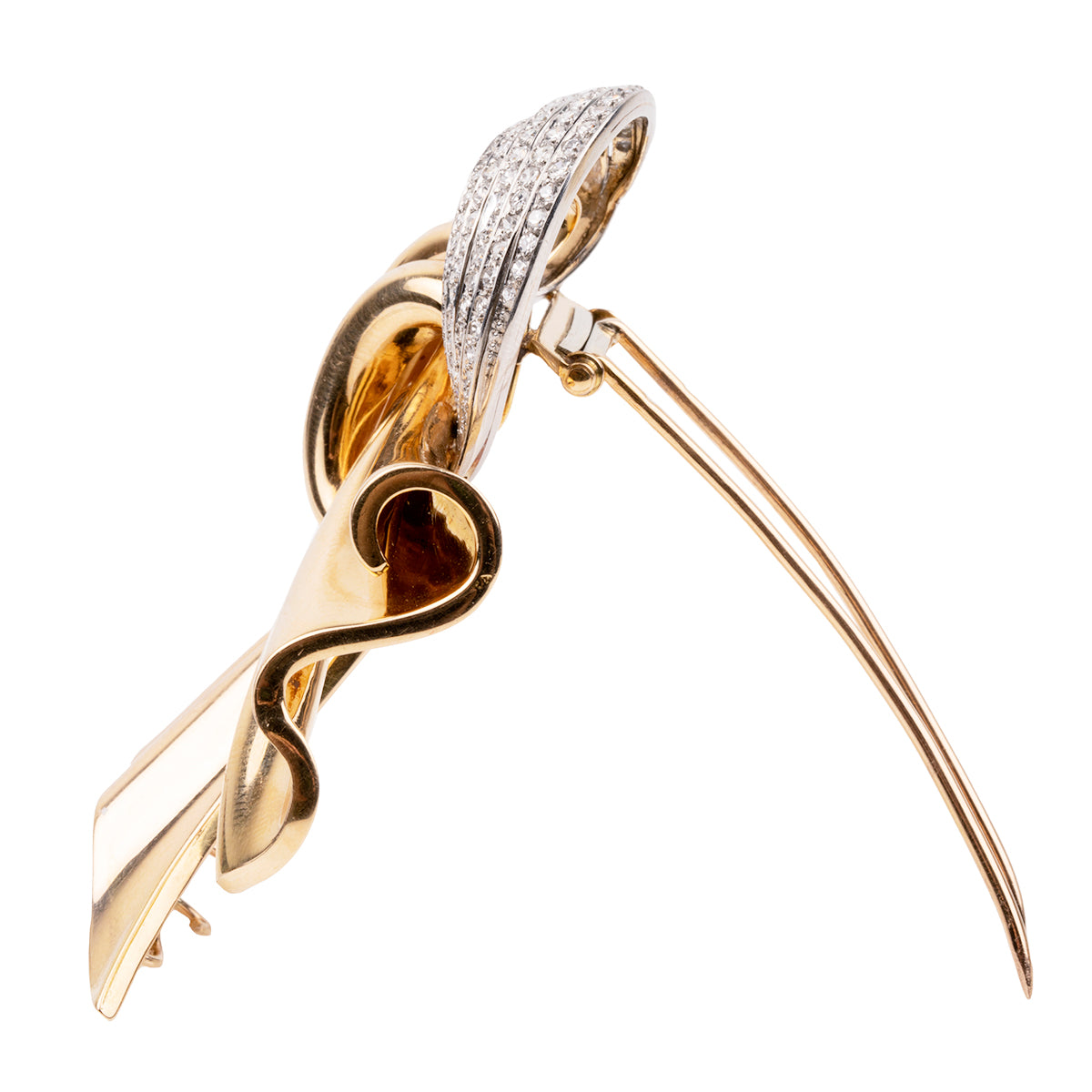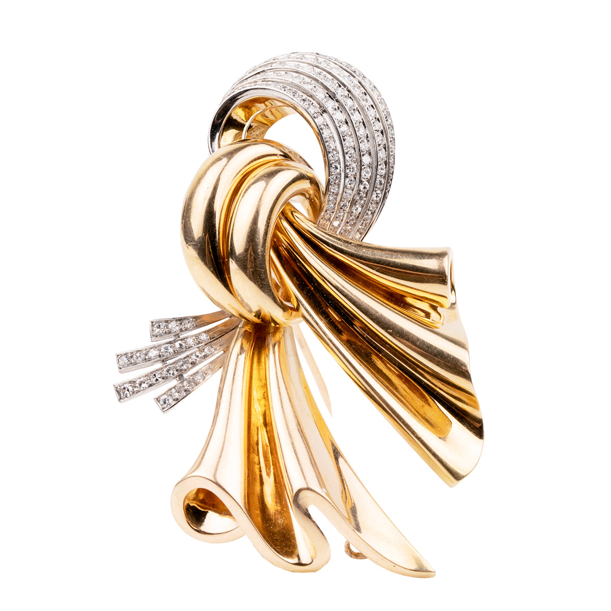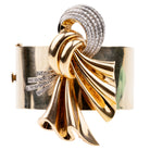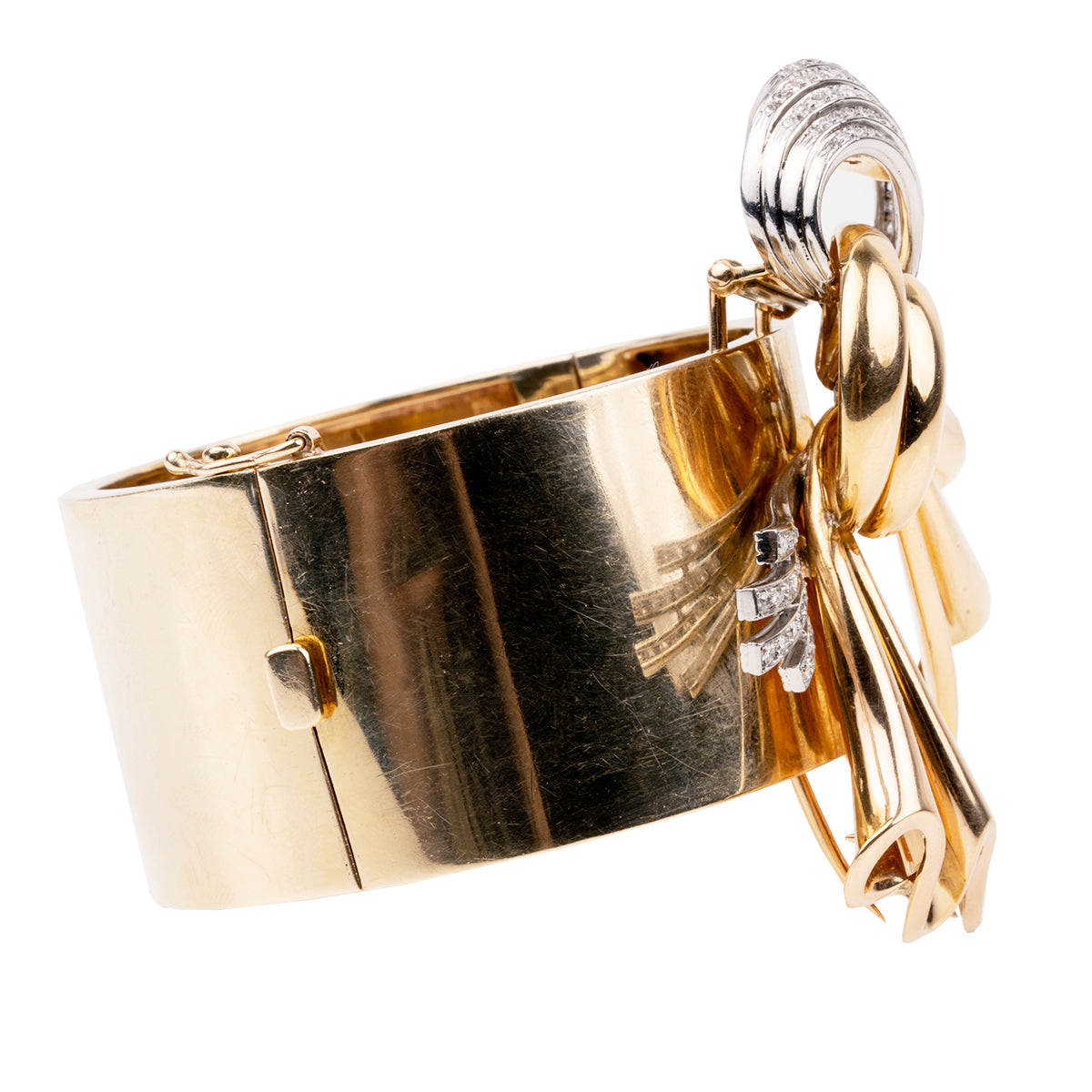 Bold scale bangle with removable retro dress clip. The clip is beautifully made in 18k gold and platinum with diamonds with French Hallmarks. There is a hinged clip mechanism to wear independently. Circa 1950.