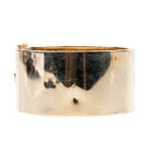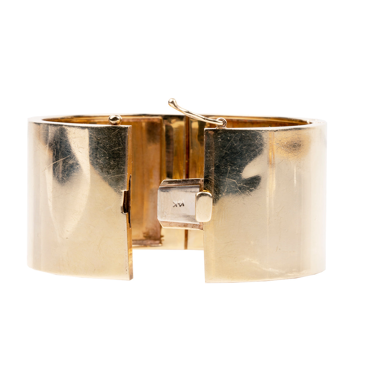 Hidden push clasp with a safety clasp. The interior diameter measures 6.25" and 2" in width. The dress clip is 3.75" in length and 2.75" wide. There is some evidence of denting where the clip attaches to the bangle, see photos for full details.