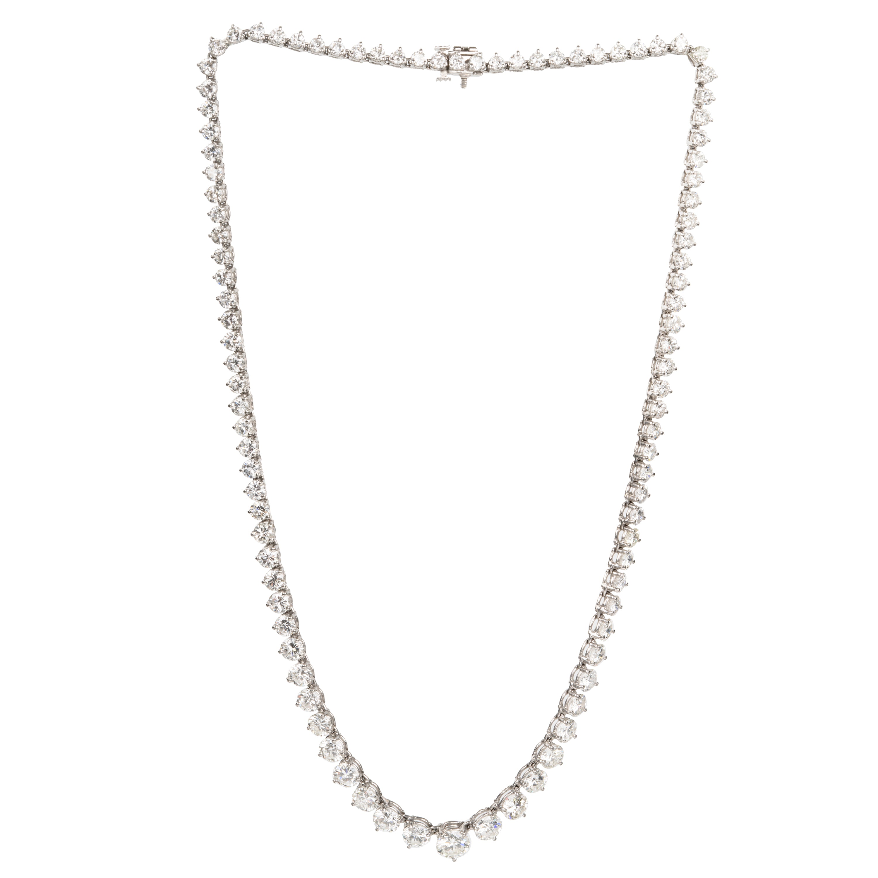Classic diamond Riviere necklace with an estimated 15 carats of diamonds set in platinum. The diamond quality ranges approx G-H color, Si1-Si2. An additional pendant can be attached to the central diamond from an invisible hinged loop. American in origin. Circa 1980.