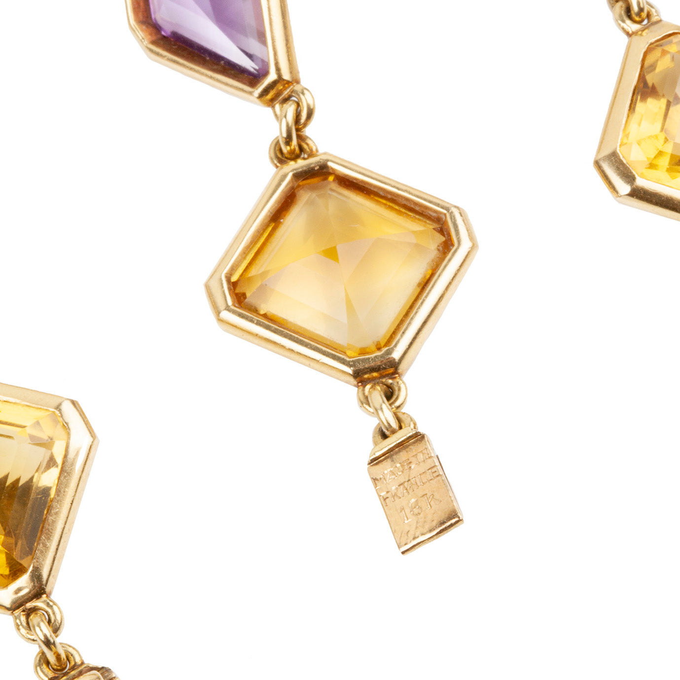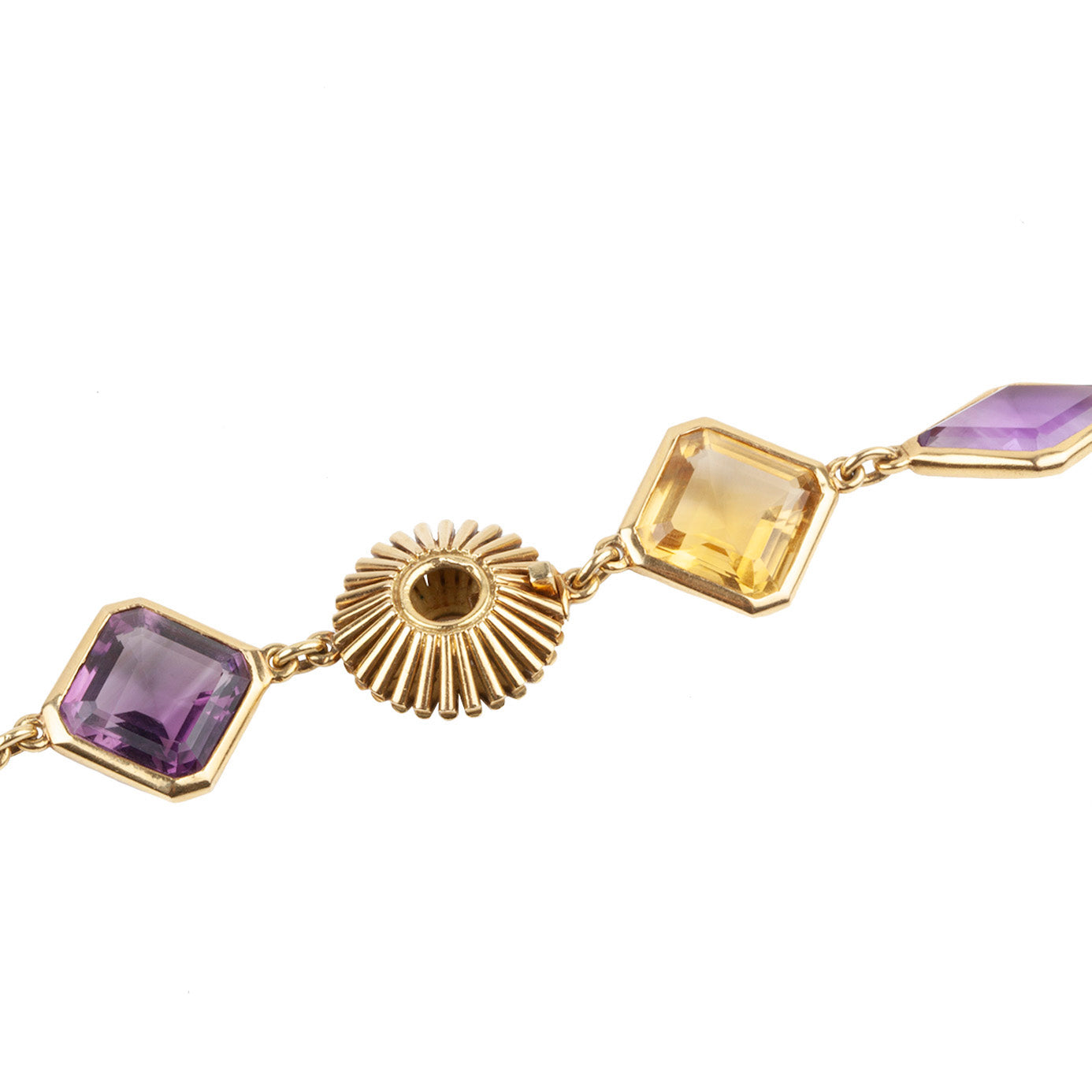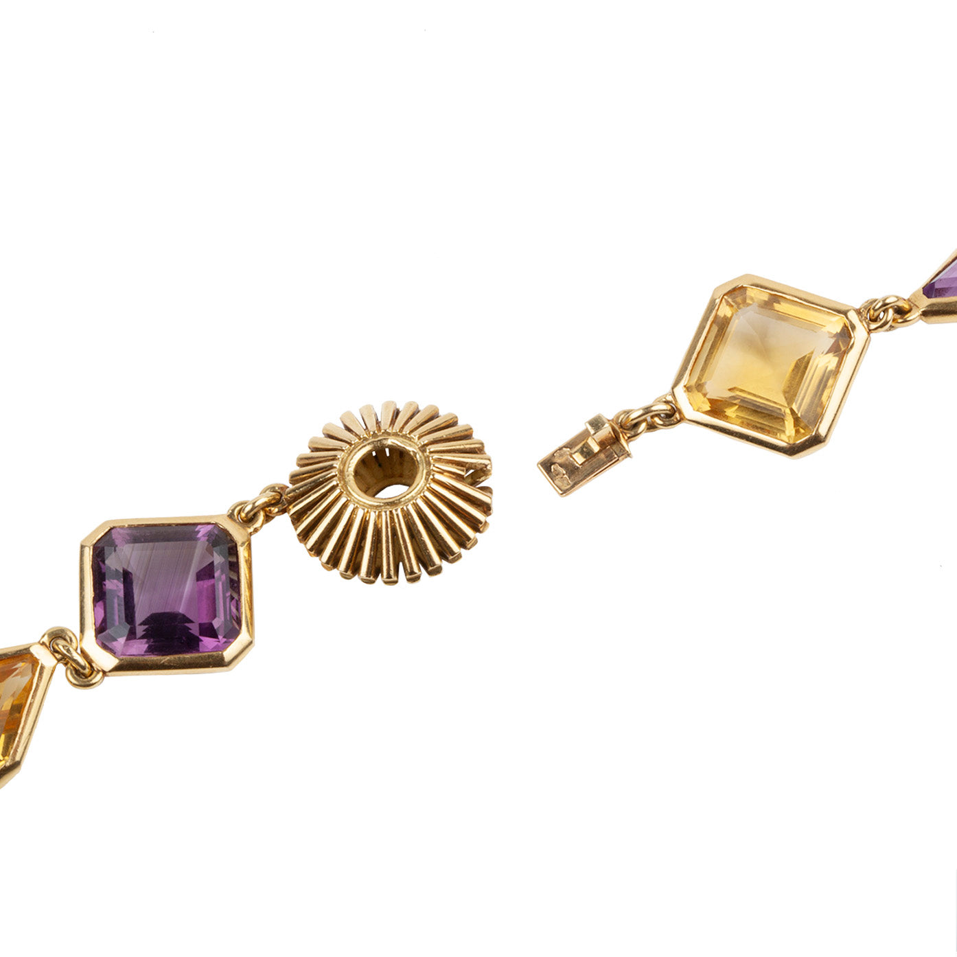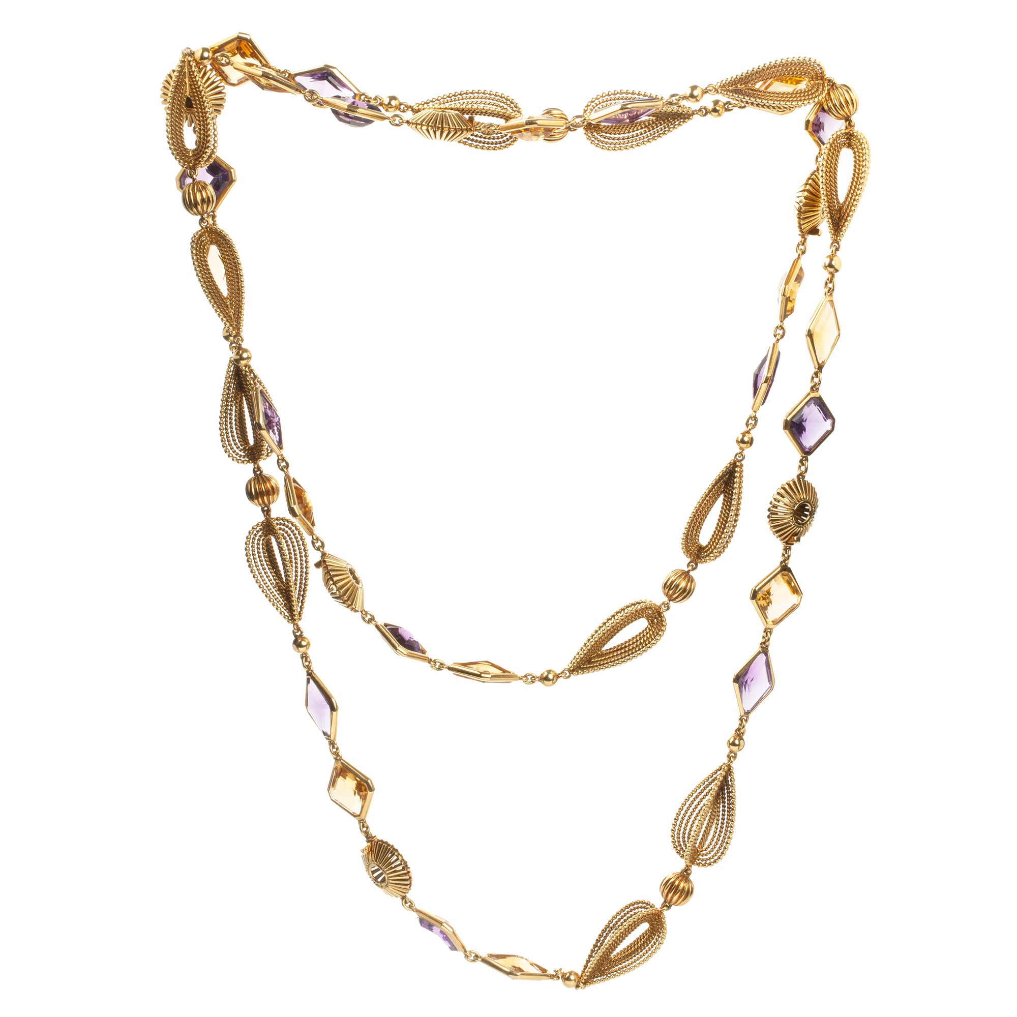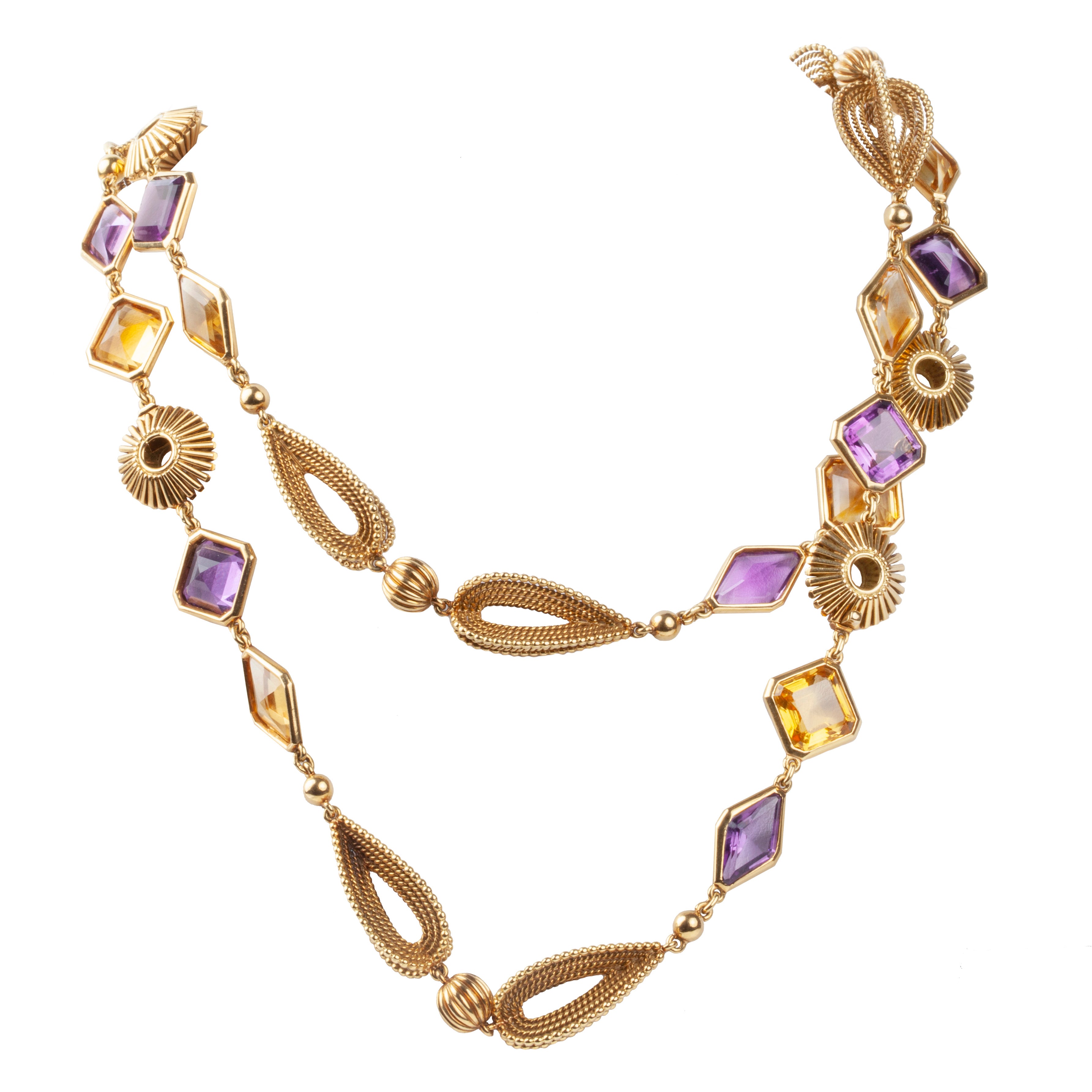 Vintage necklace that is convertible to bracelets. Masterfully made in 18k gold, beaded rope links that alternate with bezel set amethyst and citrine stones. The necklace has six individual hidden clasps allowing it to be worn in a variety of ways. French hallmarks as well as a hand engraved origin mark "Made in France 18k". Circa 1960.