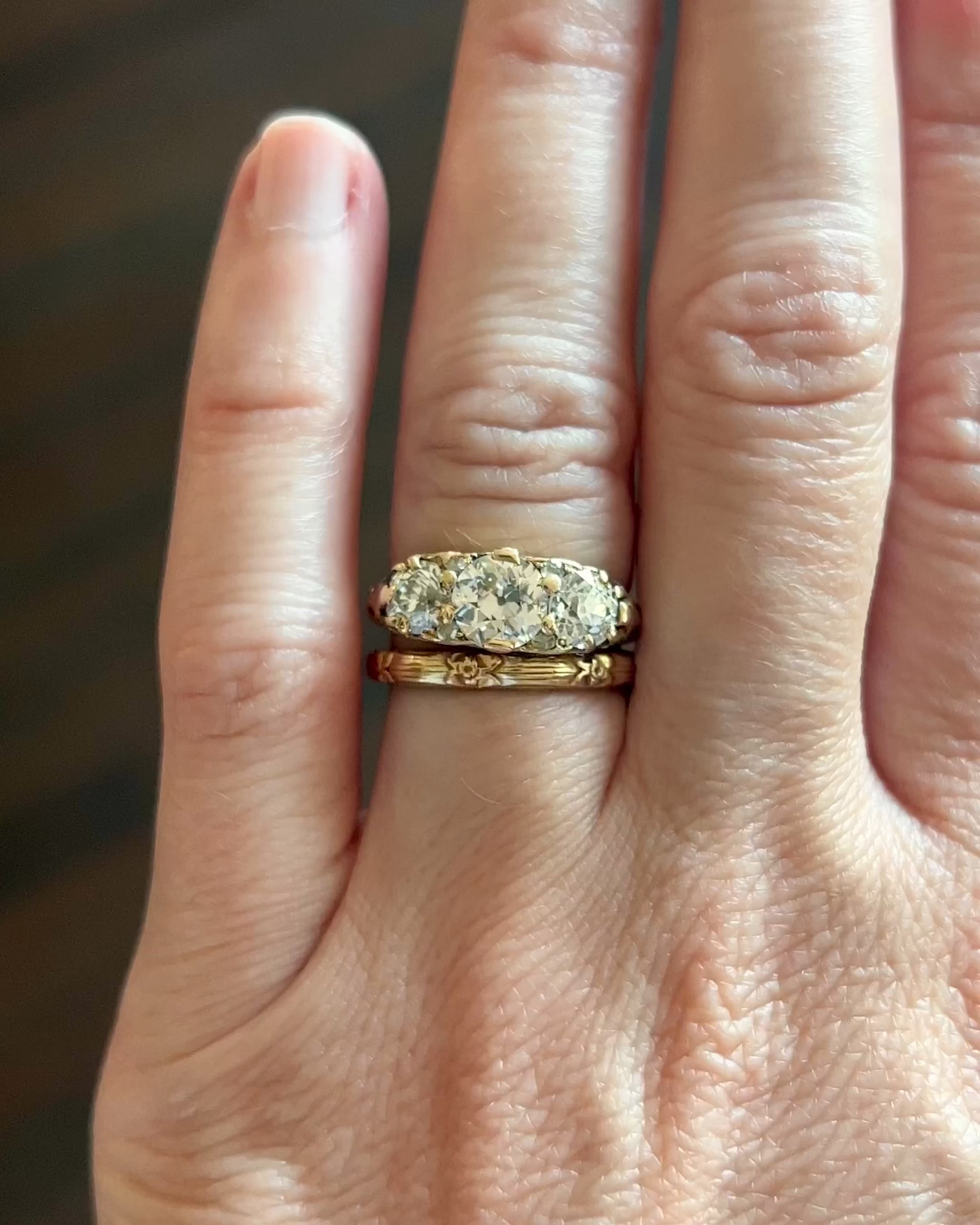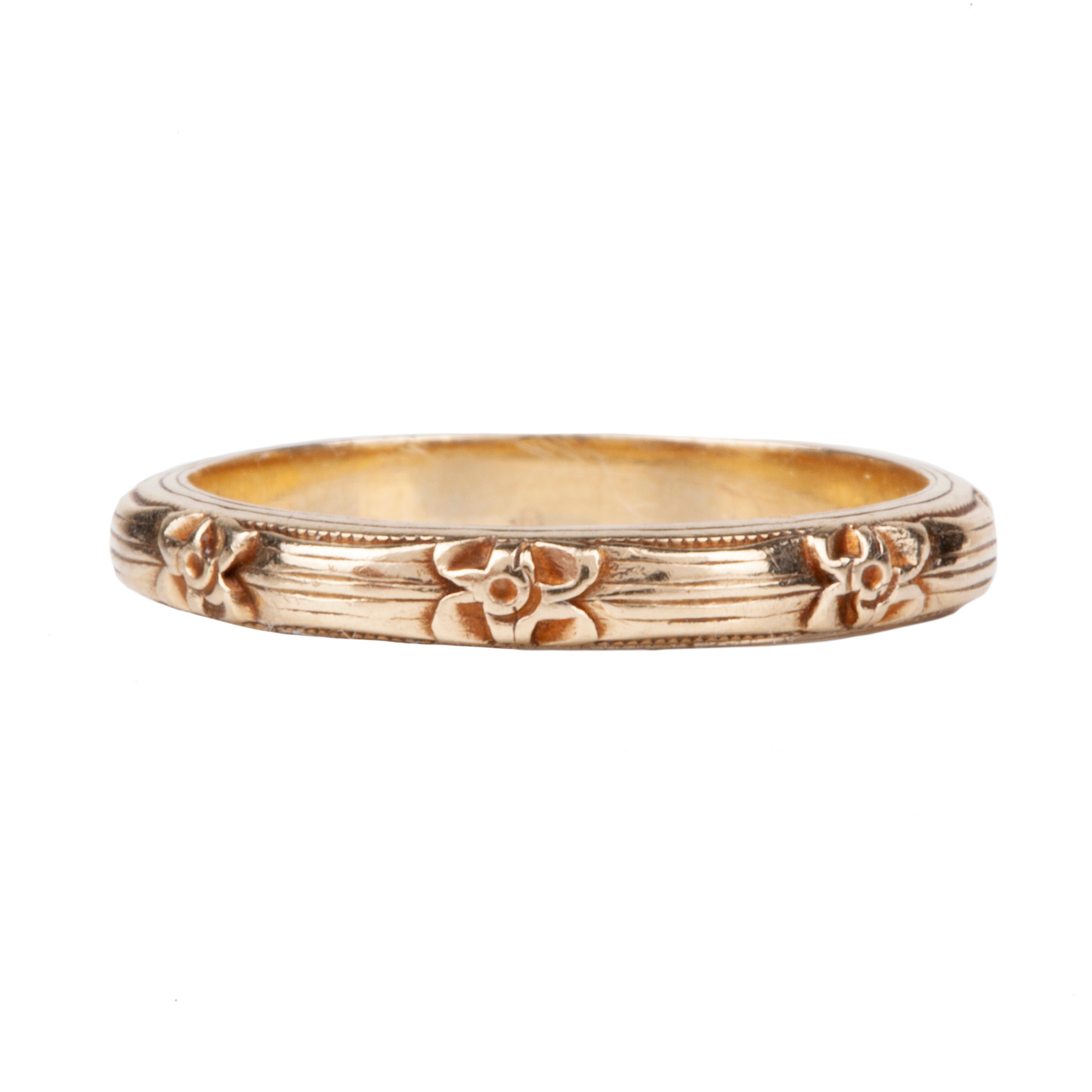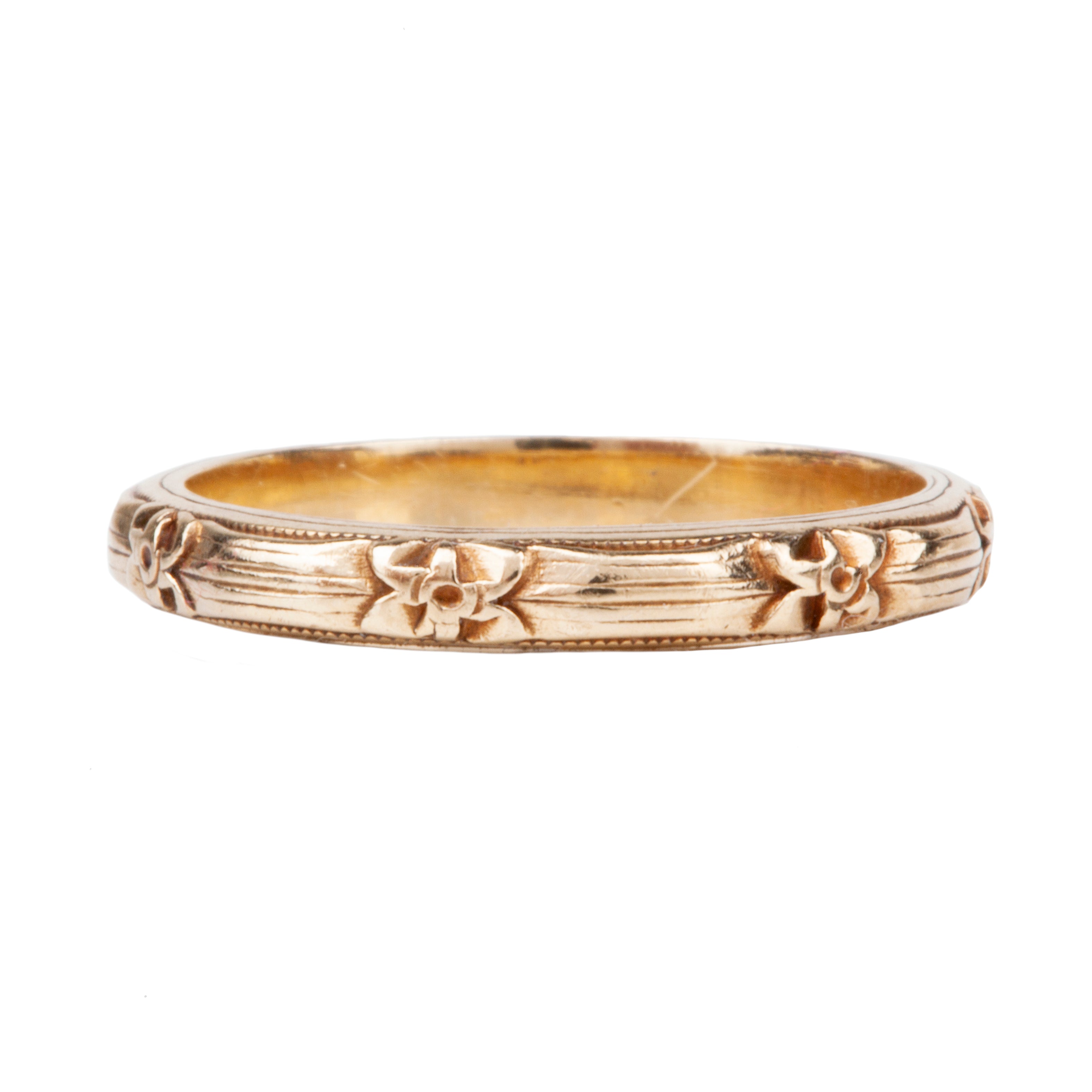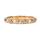 Vintage 14k gold band. Hand engraved floral and reeded engraved details surround the band. Perfect for stacking with other rings.