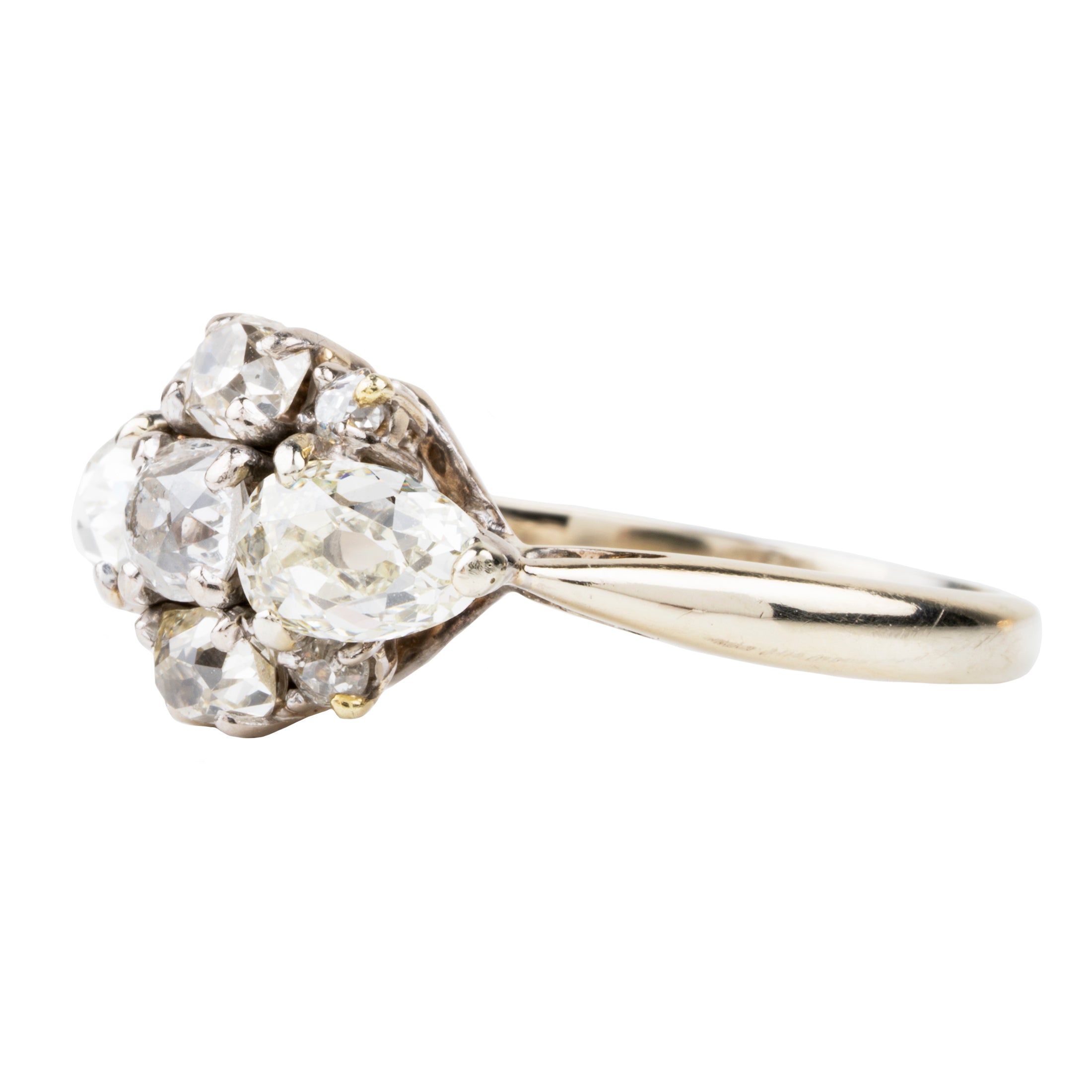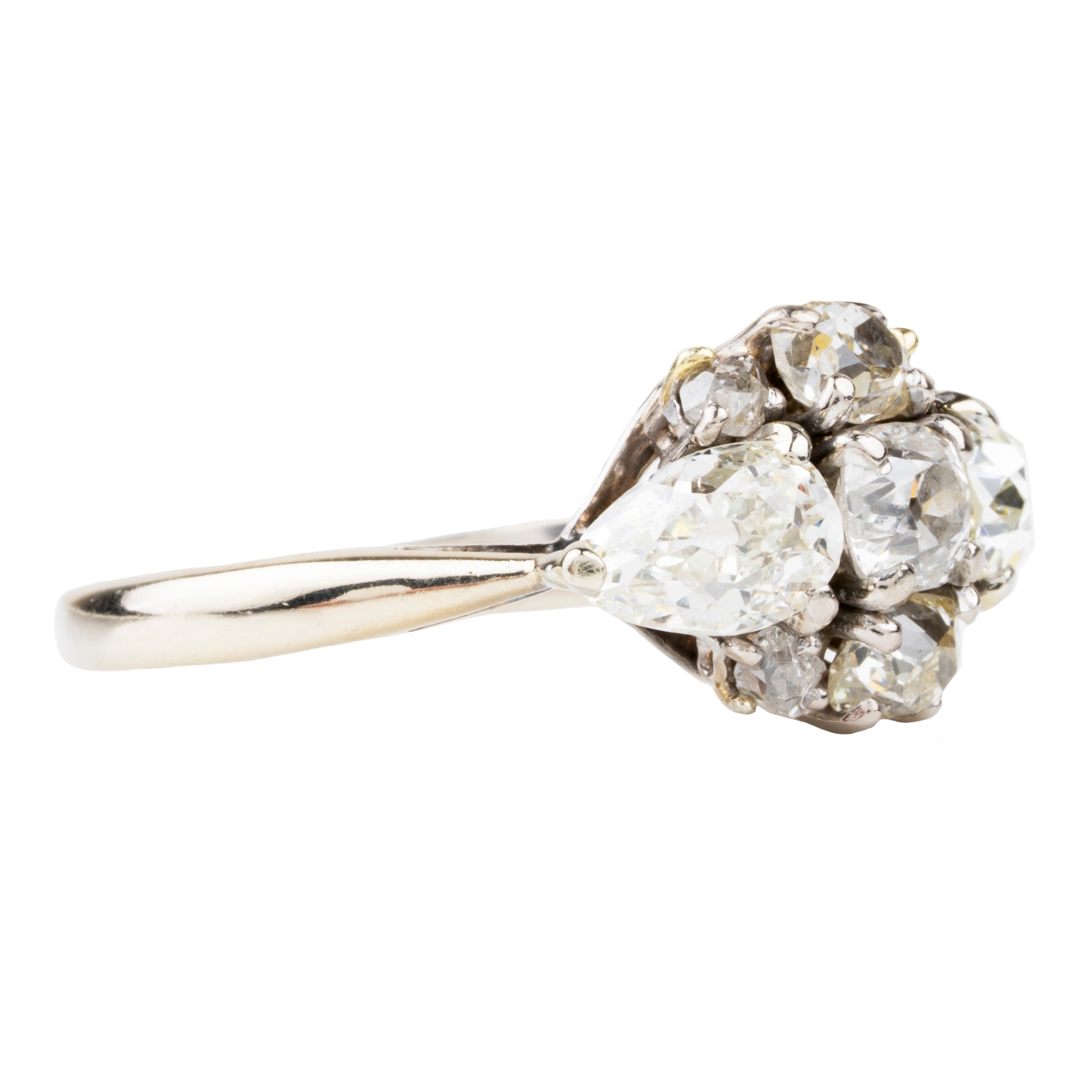 Vintage French antique diamond cluster ring, in 18k white gold. Five old cut diamonds, two pear shaped diamonds, and three old mine cut diamonds. French hallmarks.
