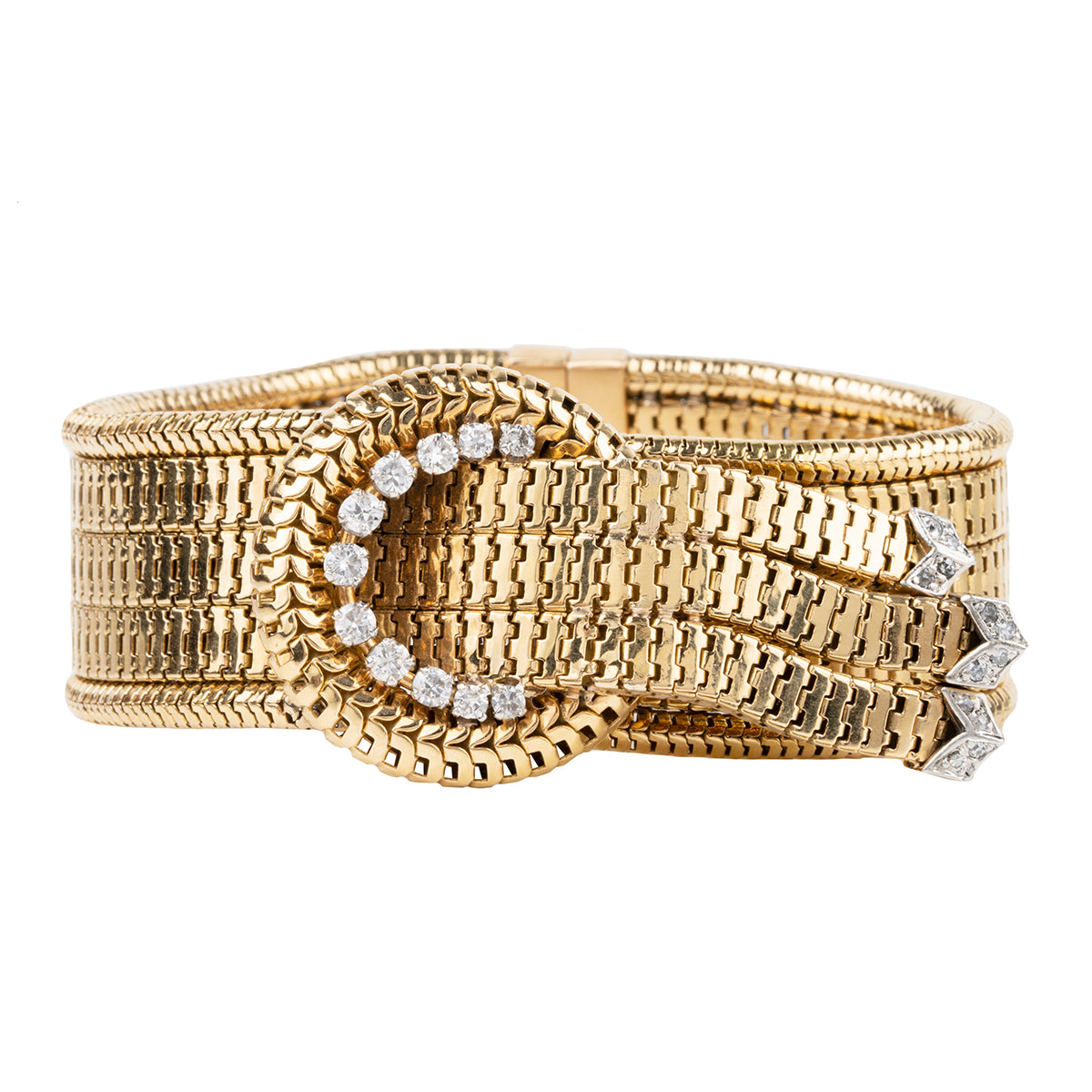Vintage French heavy gold and diamond bracelet, in 18k gold. In a buckle motif with platinum and diamond chain tassels. French in Origin. Circa 1940.