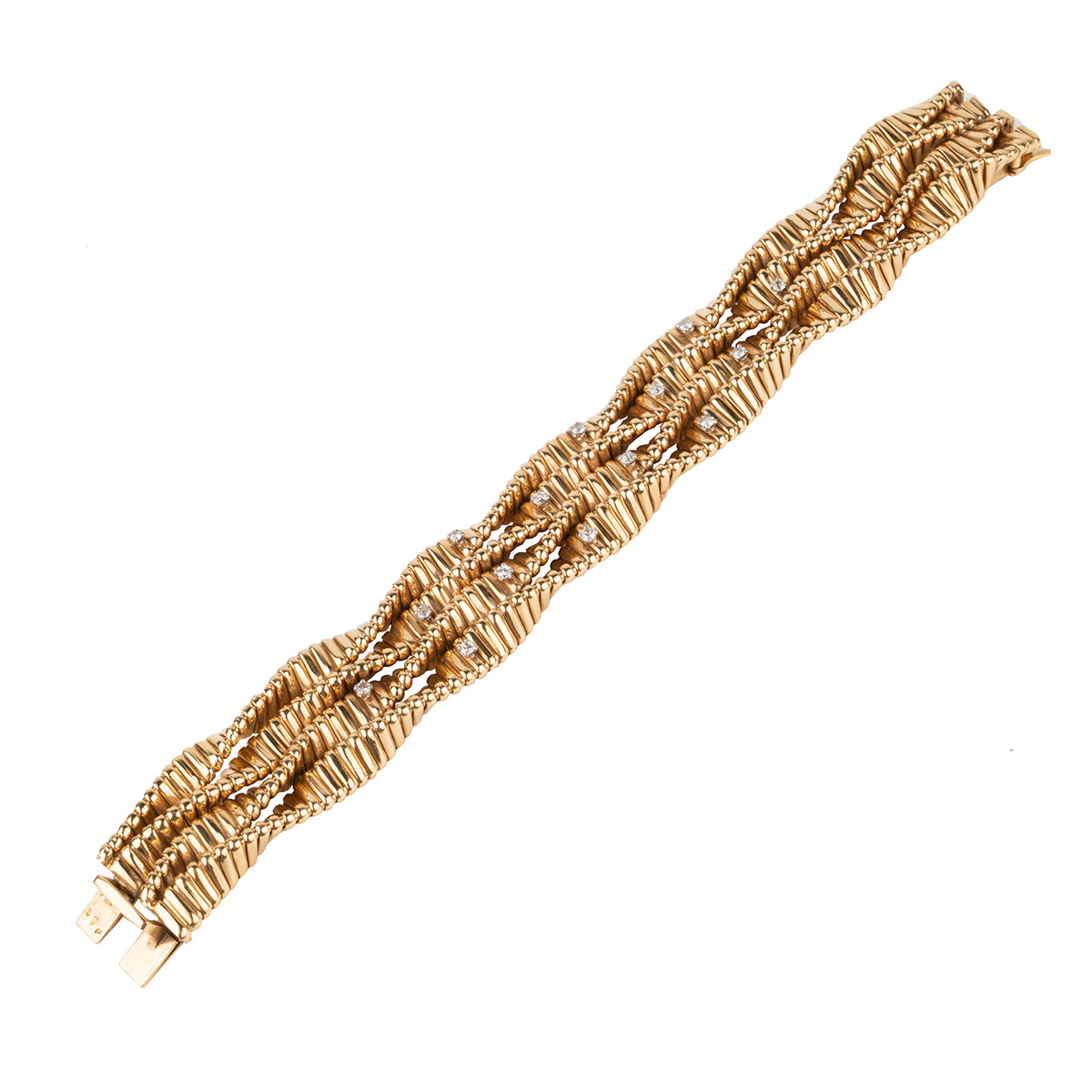 Vintage French bracelet, in 18k gold. A bold design with twisted links with 14 round brilliant cut diamonds set in platinum. French in origin. Made in post-war Paris in the late 1940's.