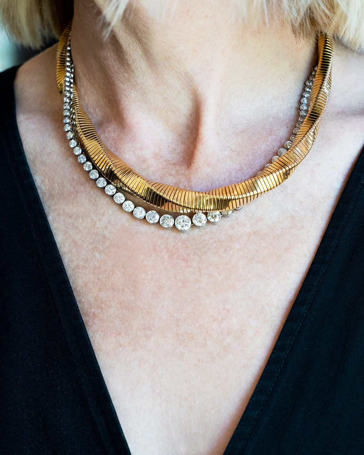 It has a hidden push clasp and measures 16" in total length. It is worn with a French diamond riviere necklace. Email info@bellandbird.com for full details.