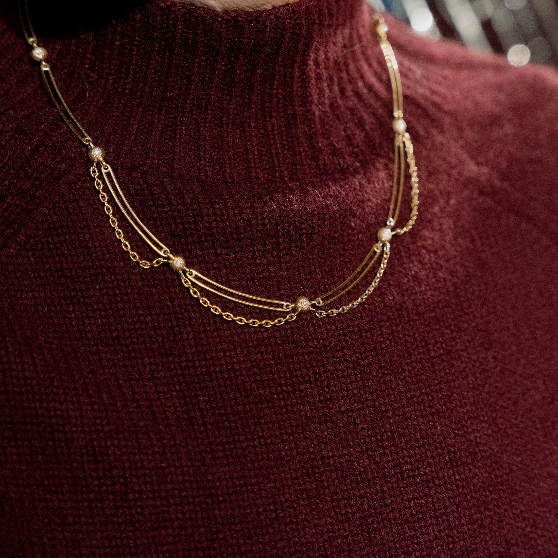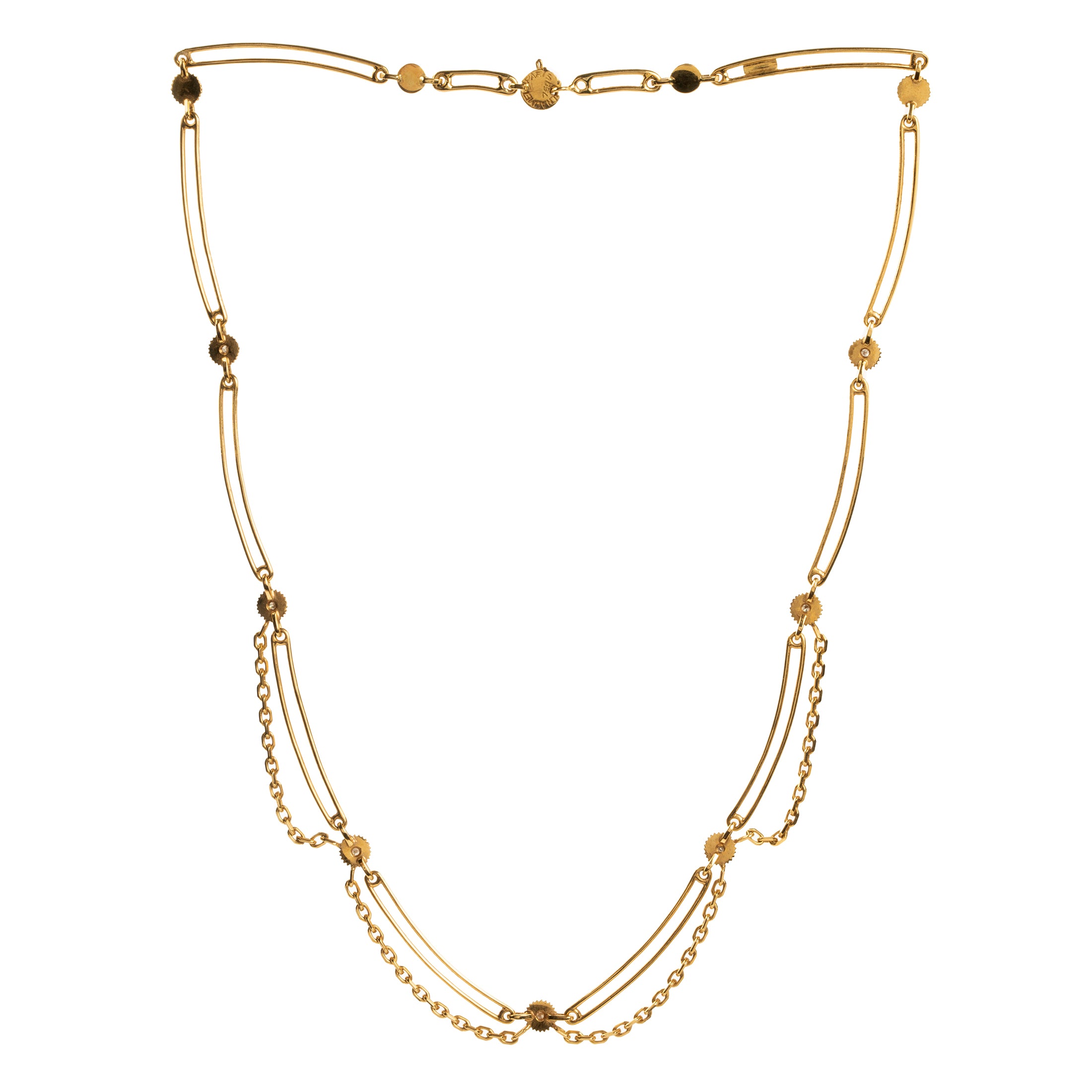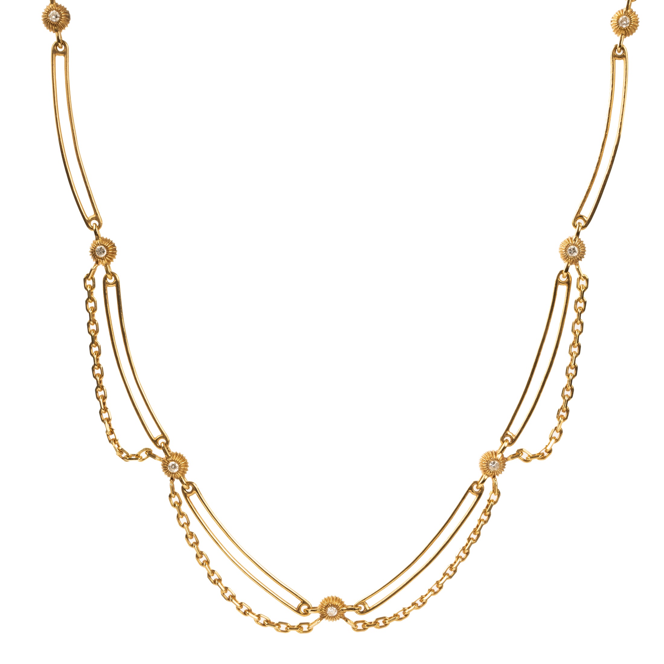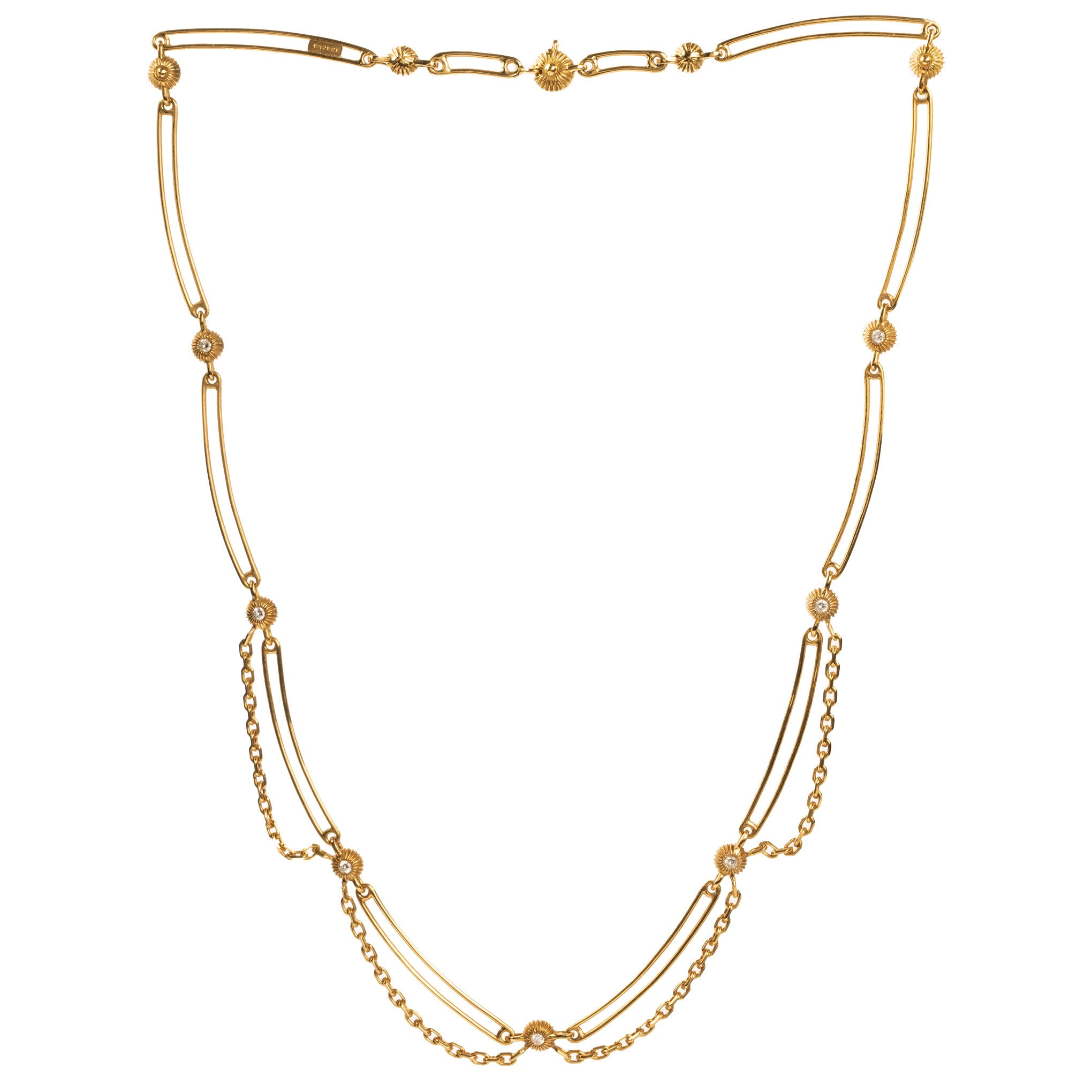 Vintage 18k gold necklace by the French house, Chaumet. Seven round diamonds set in reeded medallion settings with gold swaged chains. Total approximate carat weight is .4 carats. Paris Hallmarks. Circa 1970.