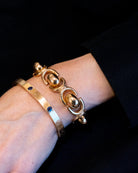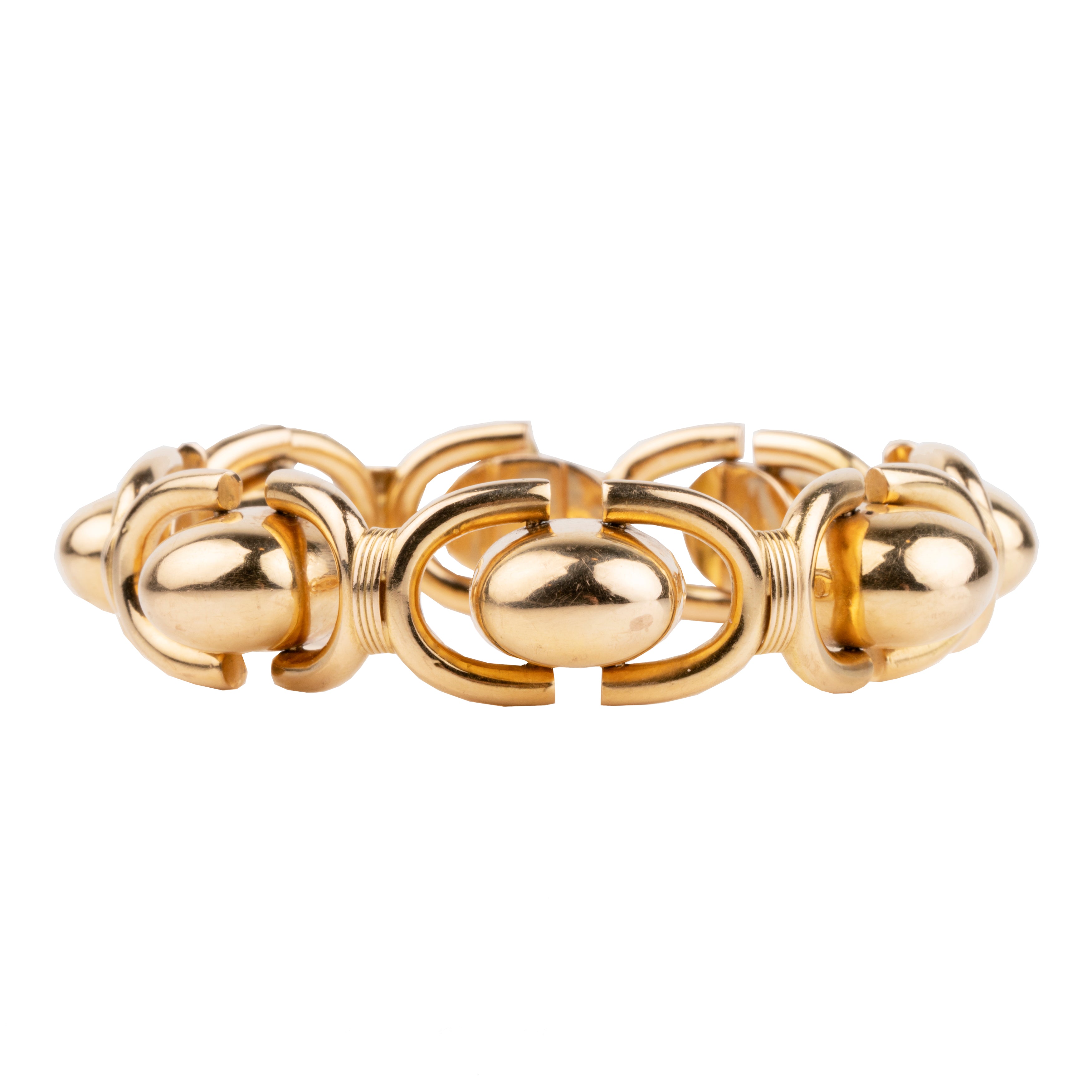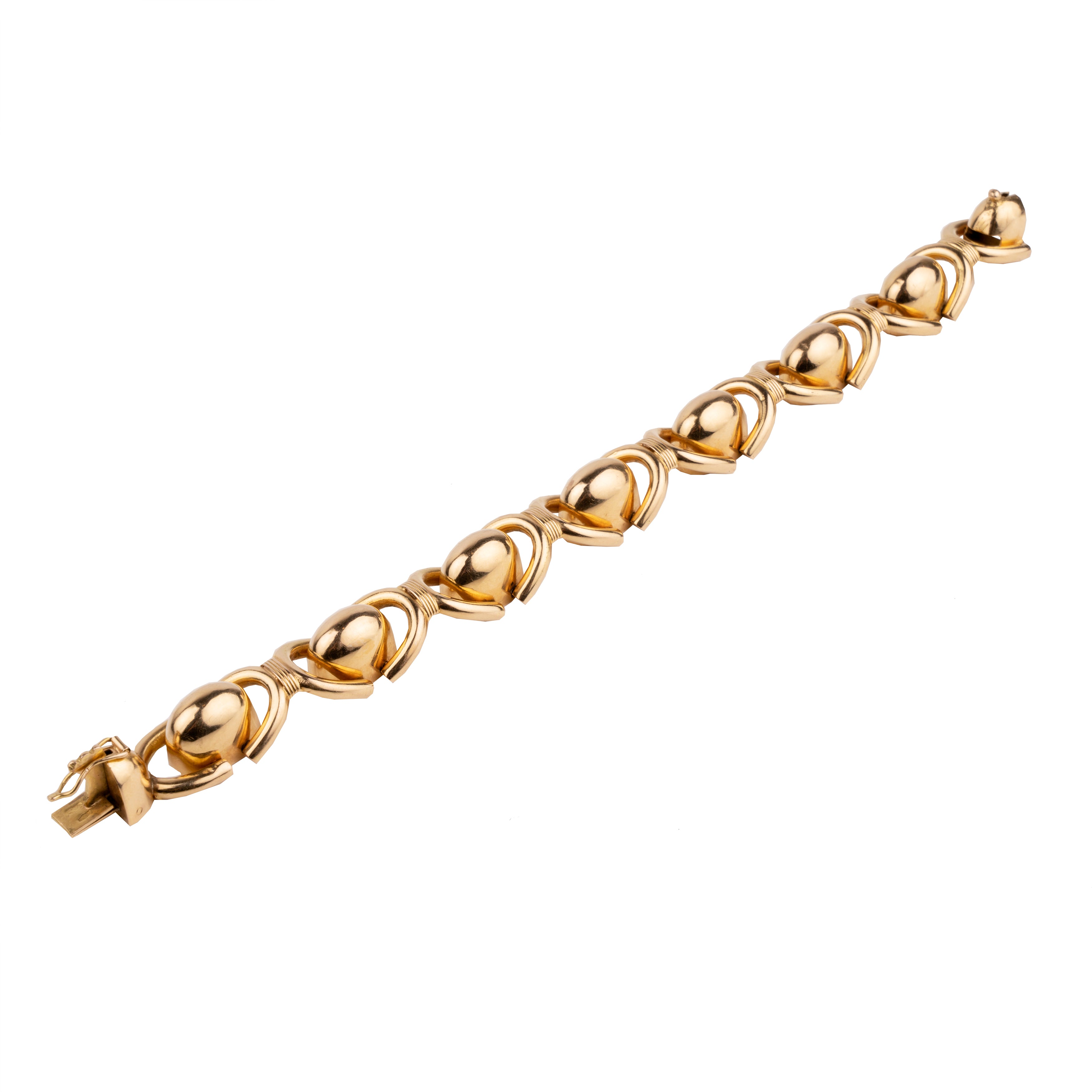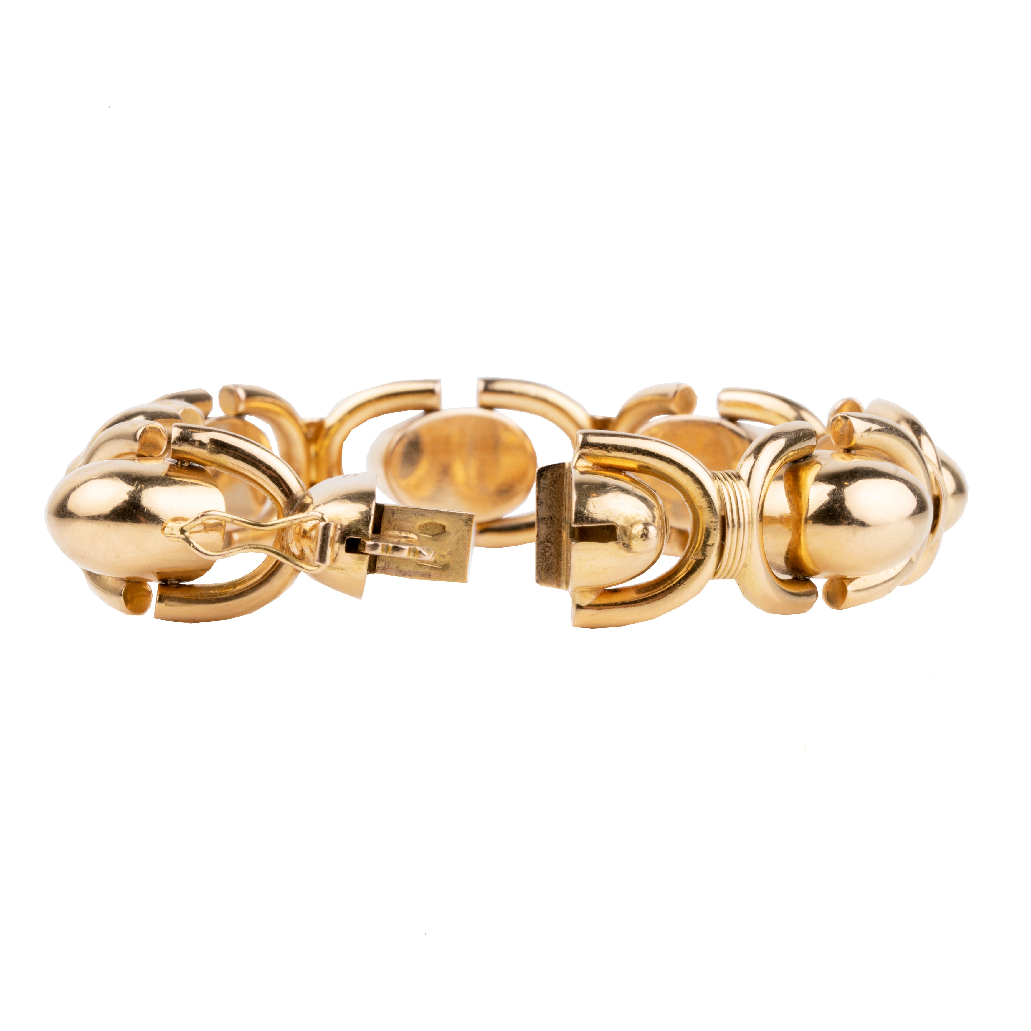 An 18k gold vintage linked bracelet. Would be great for layering or wearing alone. Figural shapes. Italian in origin. Circa 1950.