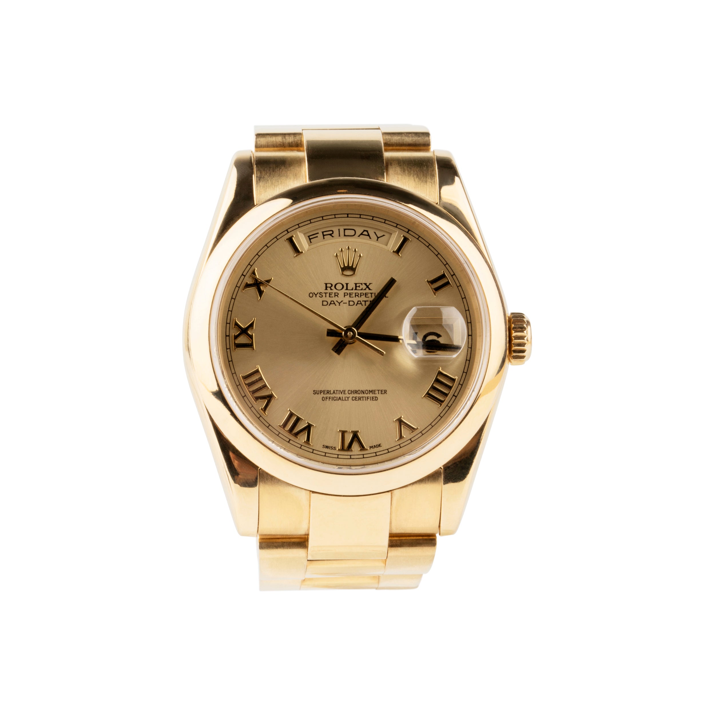 A timeless watch. 36mm Rolex Day Date with Oyster bracelet in 18k yellow gold. Model number 118208. Circa 2000.