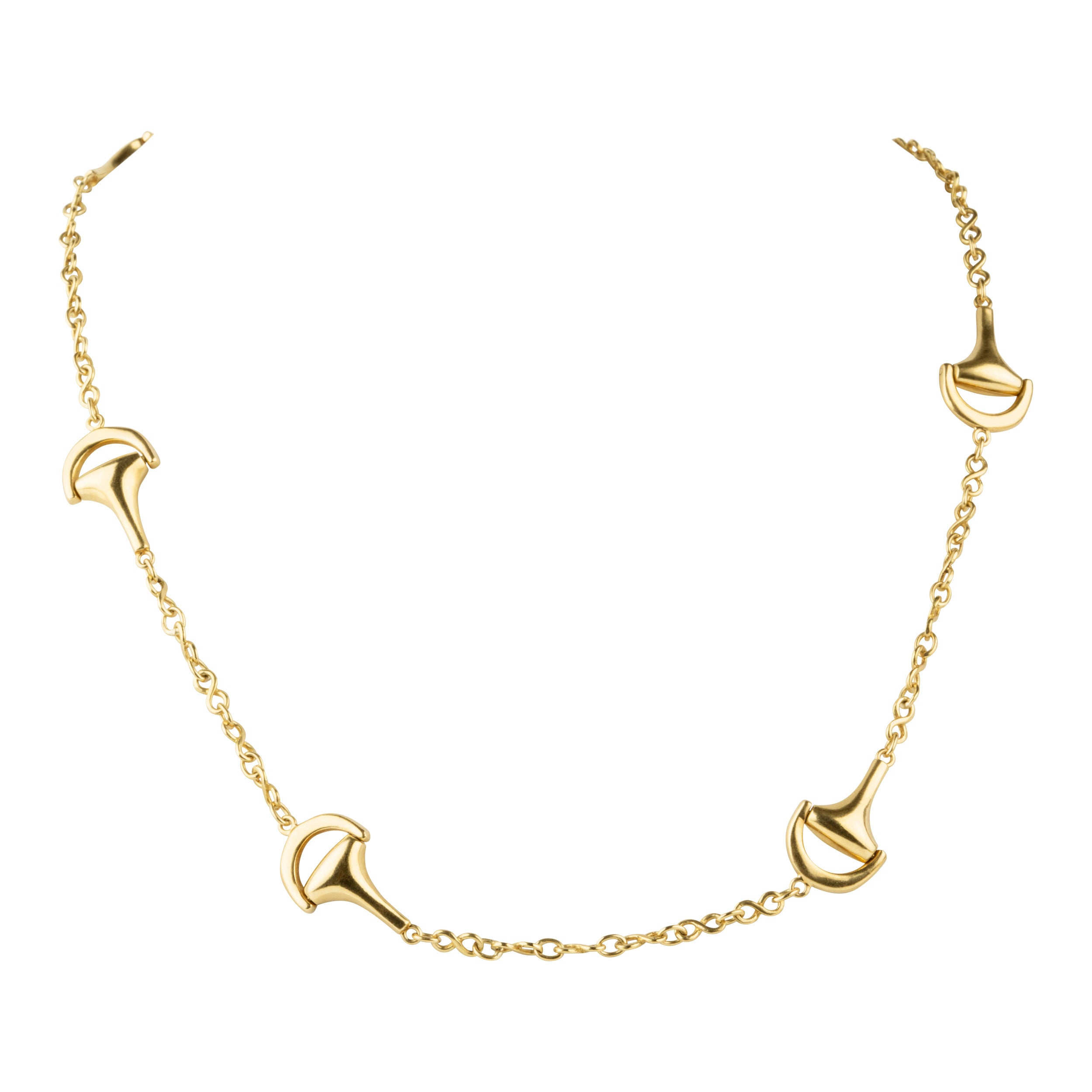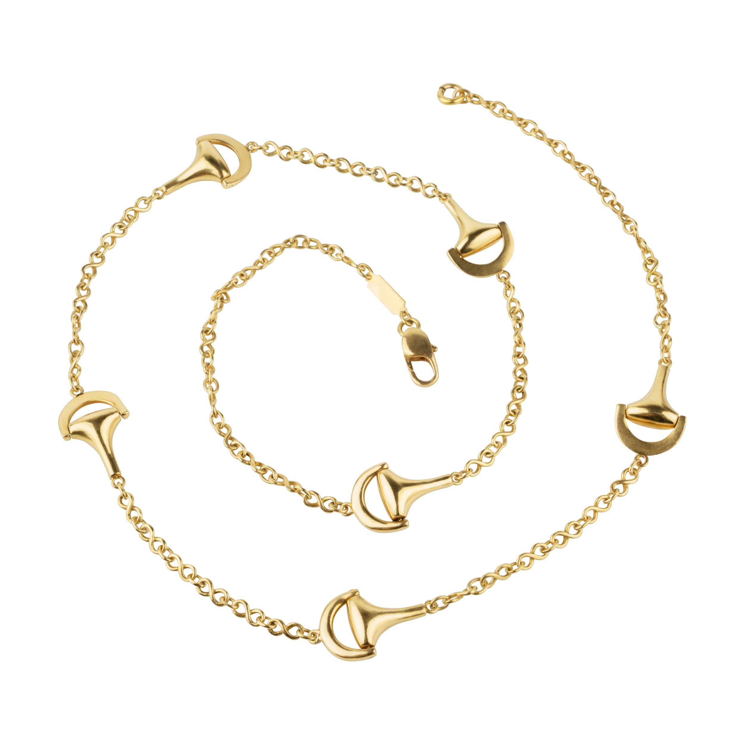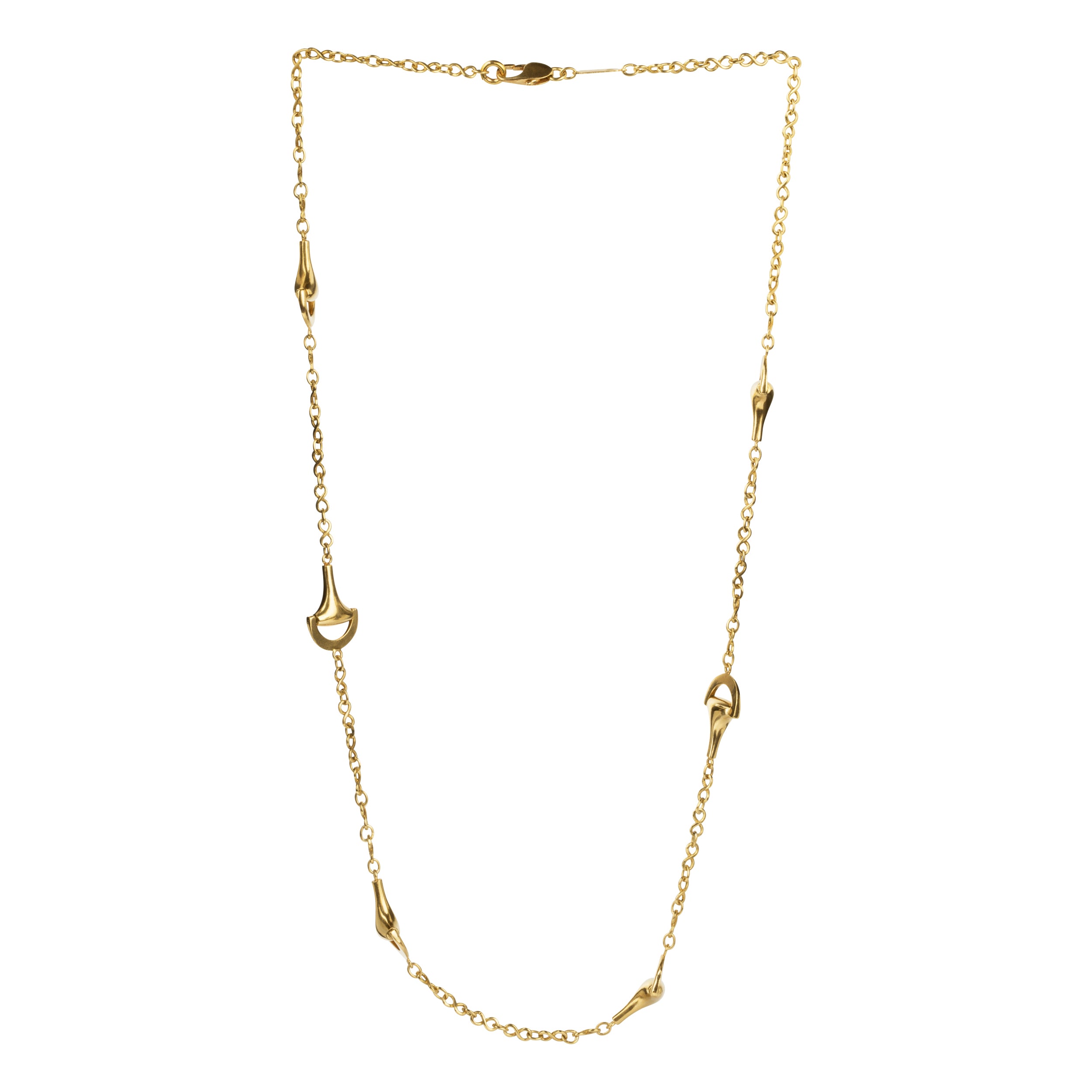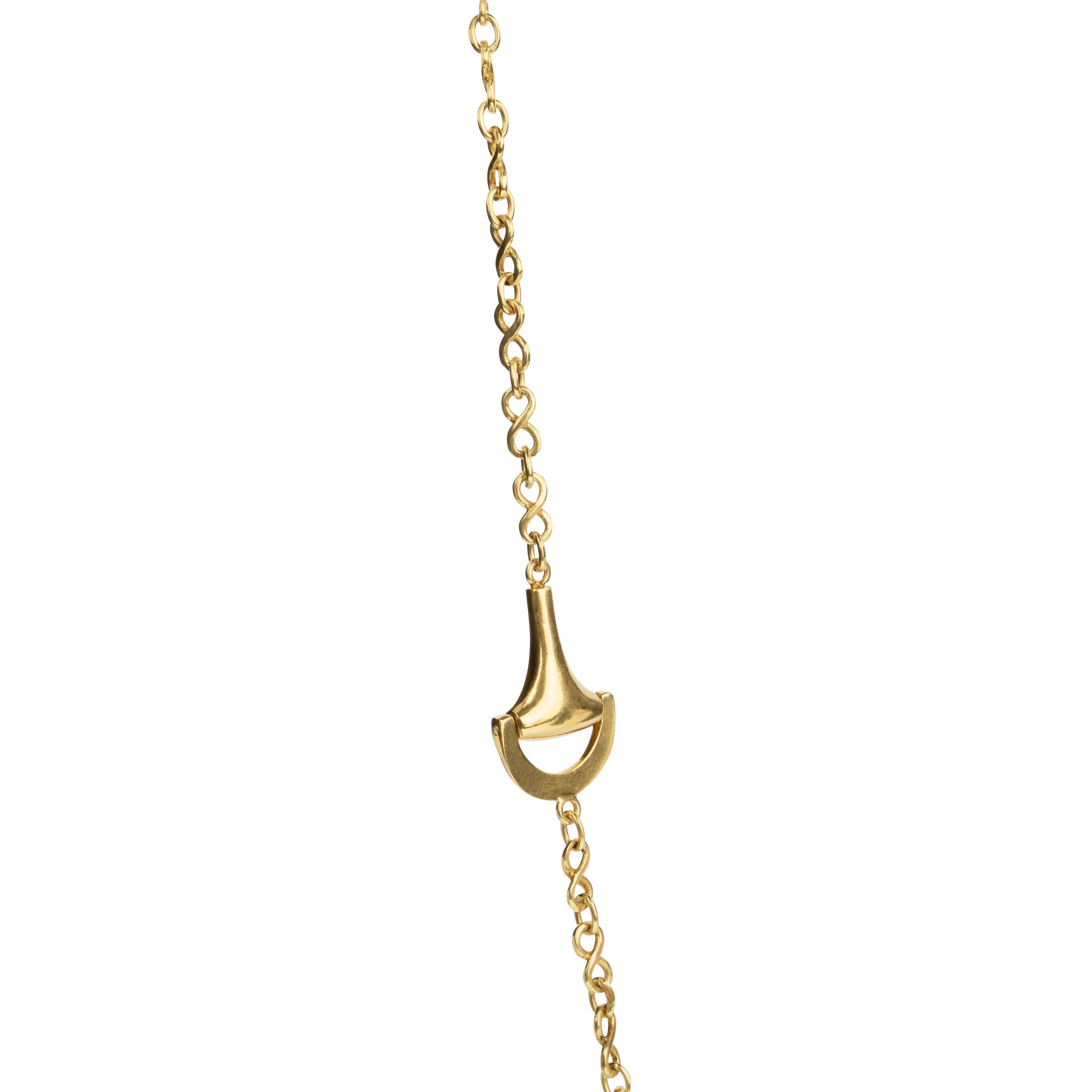 A solid handmade chain with an equestrian motif in 18k yellow gold. The necklace is 24 inches long, but the shape of the links allows the clasp to be clasped shorter, leaving a length of chain falling down the back. Also, long enough to wrap several times on the wrist as a bracelet. The snaffle-bit links are 1 inch by .50 inches.