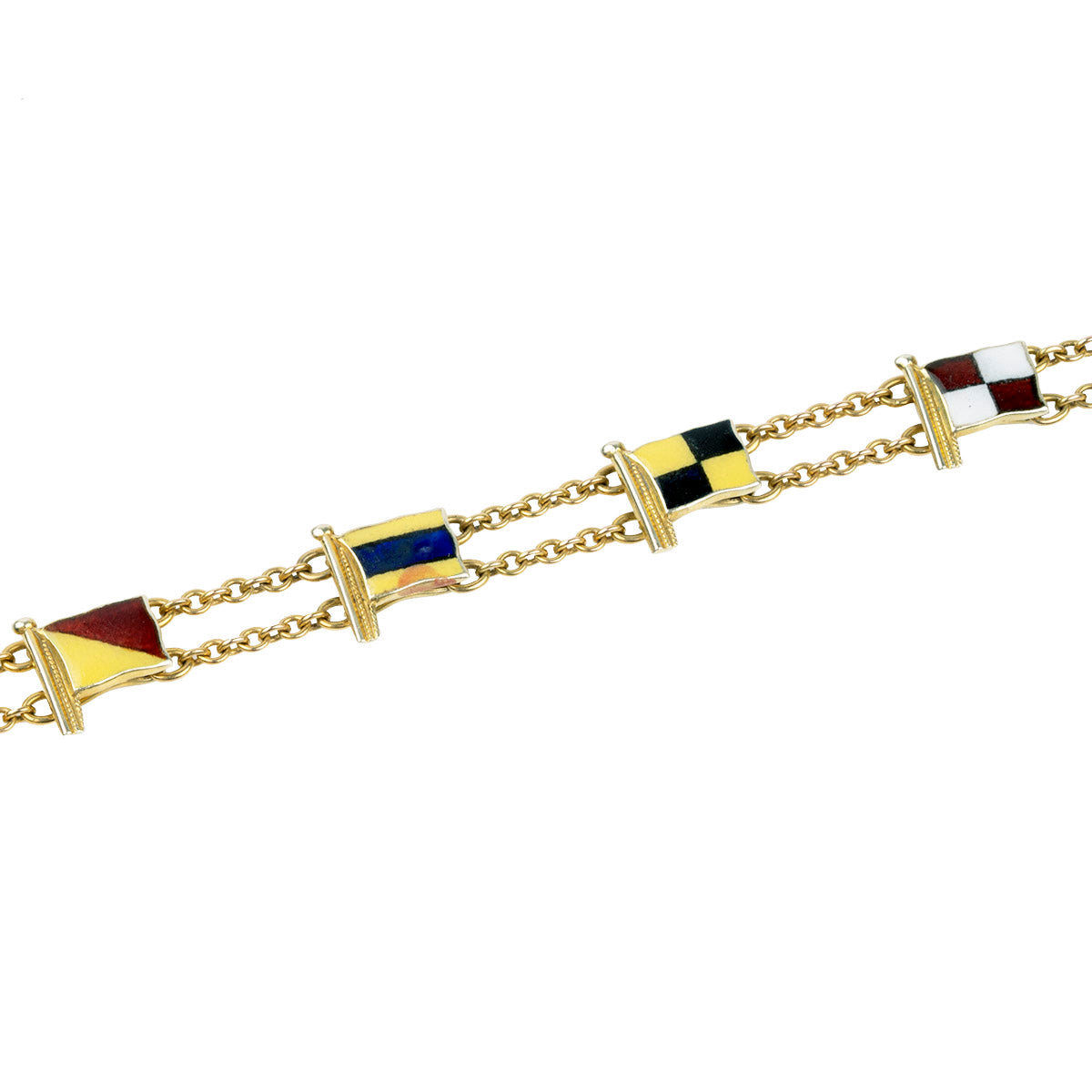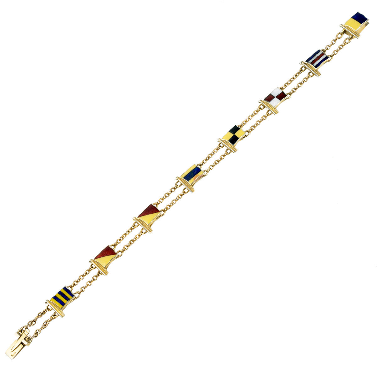 Vintage nautical flag bracelet, in 9k gold. The colored enamel nautical signal flags spell out "GOOD LUCK". Hallmarked for Renzie Cowes and London. Circa 1963.
