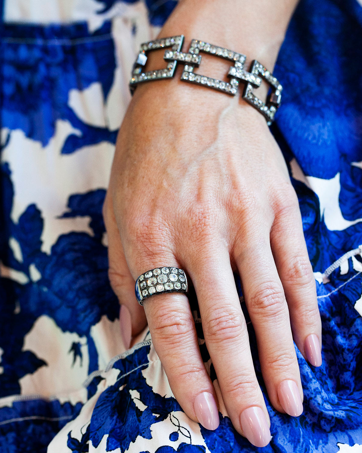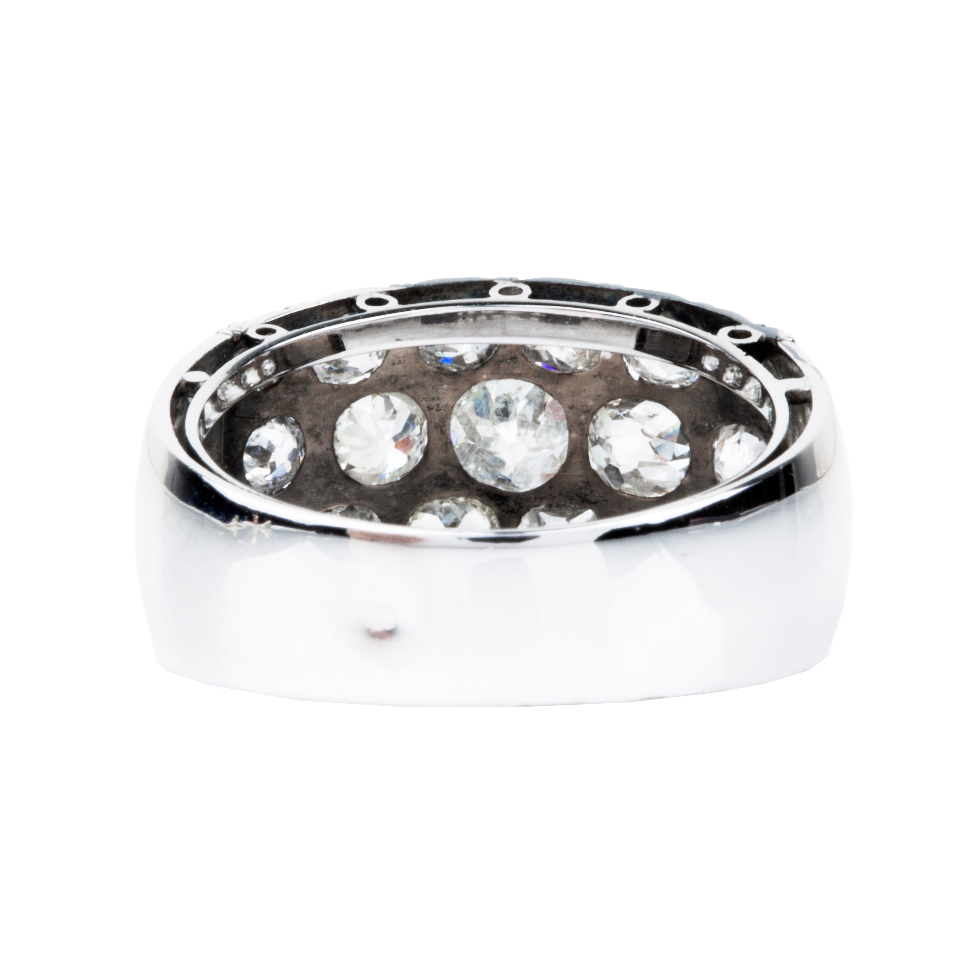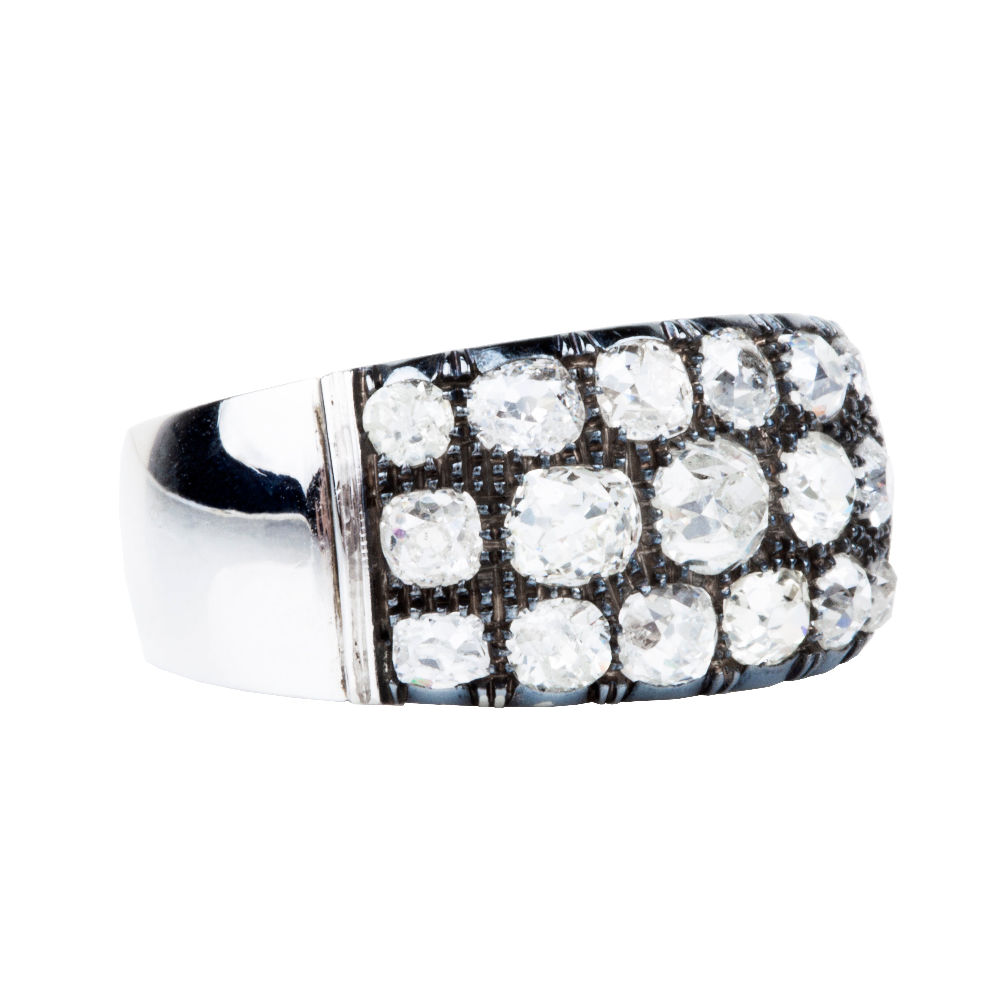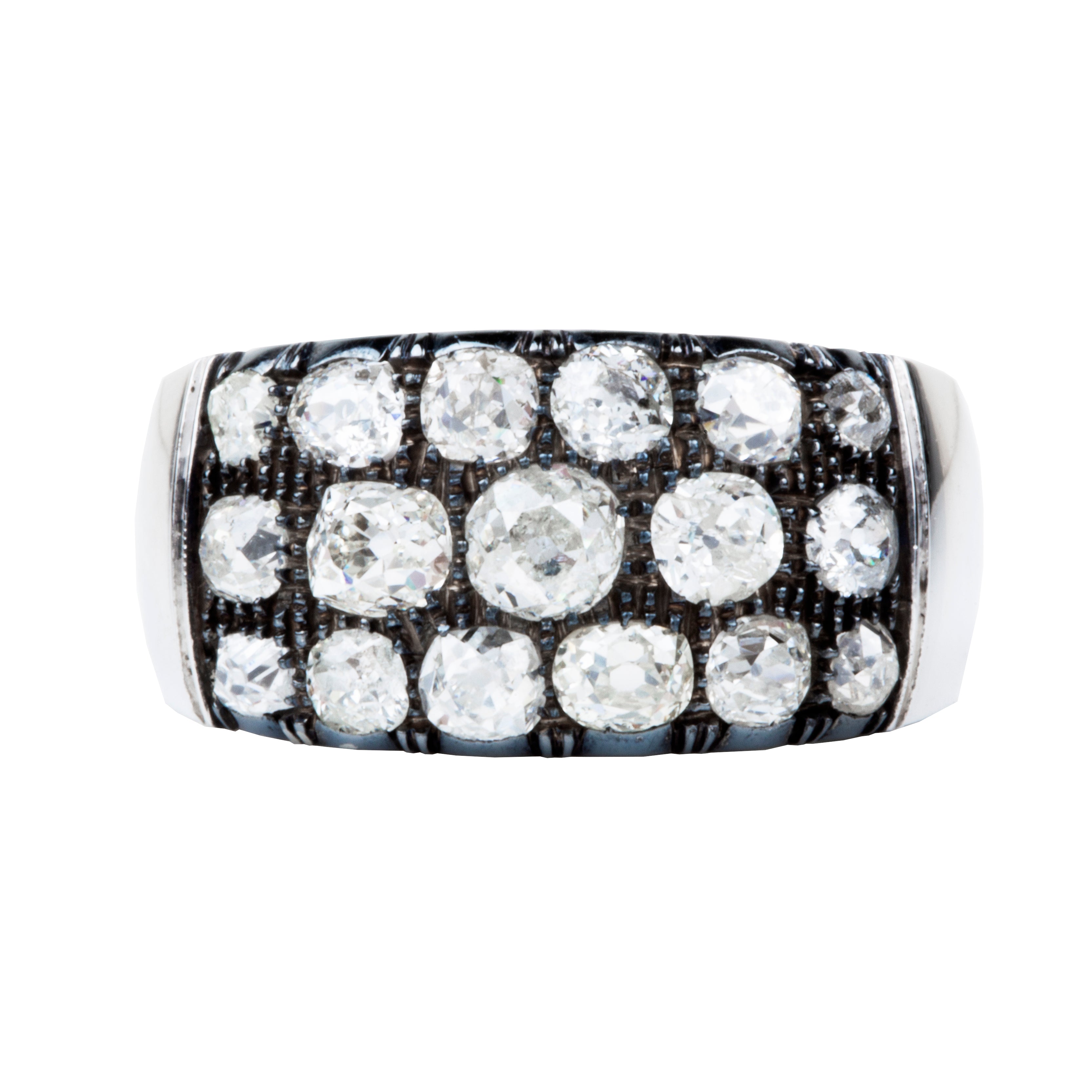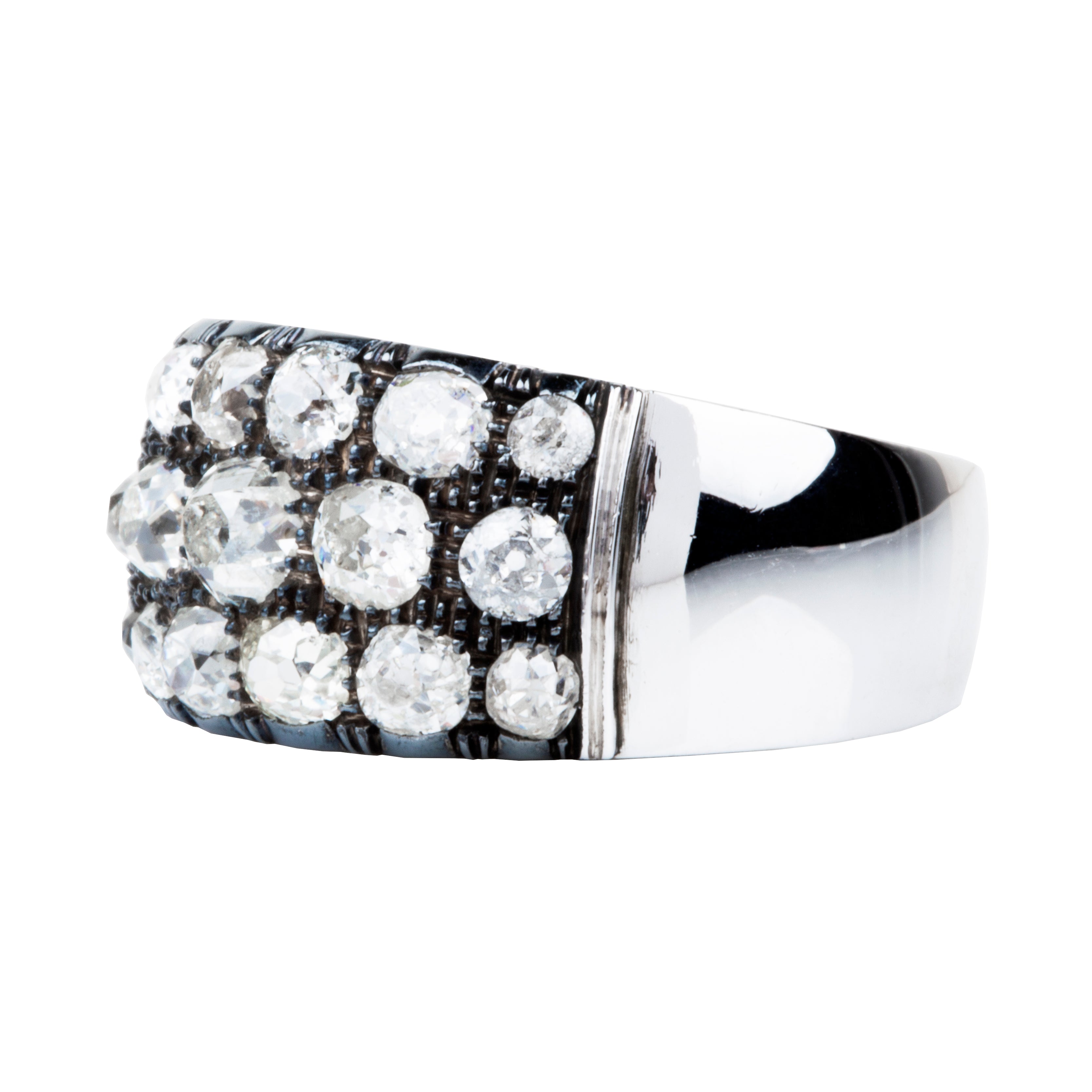 Bold vintage ring made in the spirit of Georgian Era jewels. A wide band and seventeen old mine cut diamonds, set in darkened 18k white gold. The antique stones are set in a more modern ring. The ring creates a great texture with each stone being a slightly different shape and size. Approximately 2.25 carats in total diamond weight.