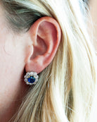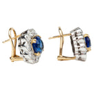Cushion cut sapphire and diamond earrings. Set in platinum and 18k gold settings. The two matched natural sapphires are approximately 4 carats in total weight, paired with round cut brilliant cut diamonds. The diamonds weigh approximately 1.50 carats in total diamond weight. English in origin. Circa 1950.