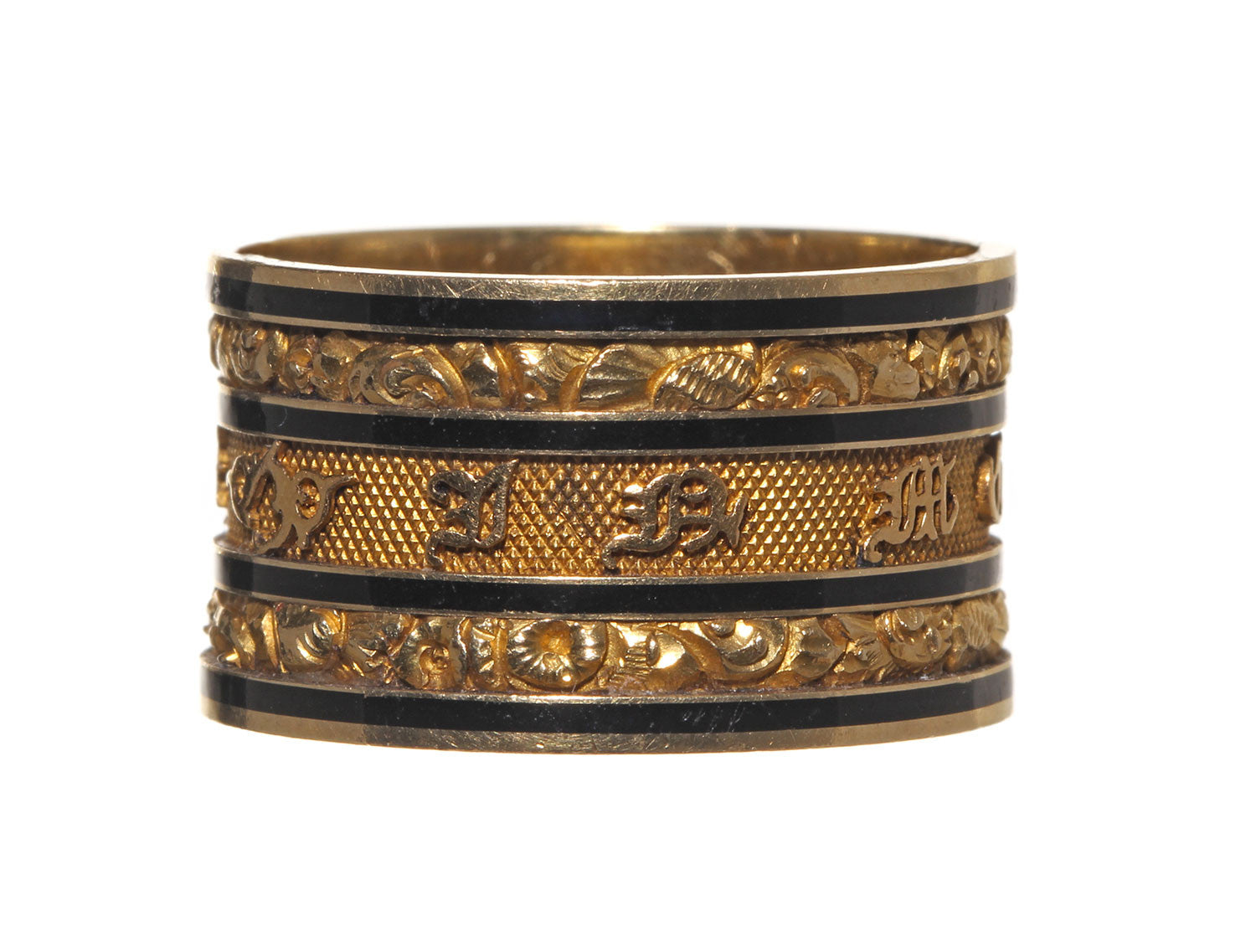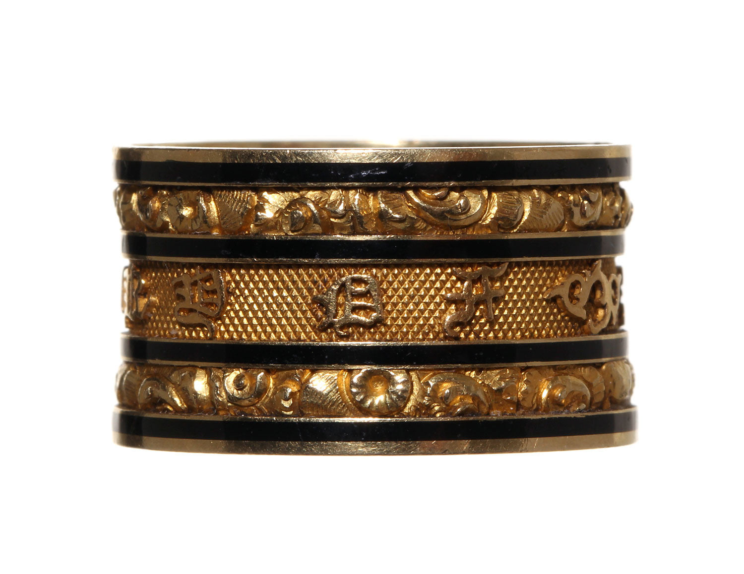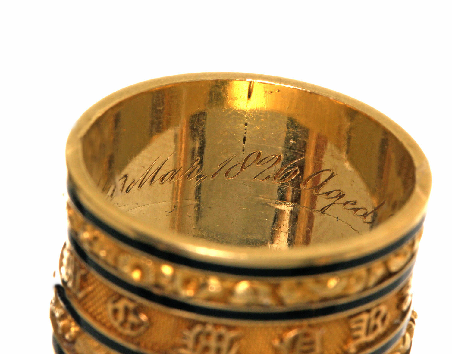 An example of an exceptionally wide mourning ring from the early 19th Century. It reads 'In Memory Of" in olde english type on the exterior of the ring. With additional engraving on the interior. These rings were bequeathed to loved ones in the deceased estate. We have another ring from the same estate that was made for another family member. English hallmarks indicate the ring was made in London in 1826. 18k Gold & black enamel.