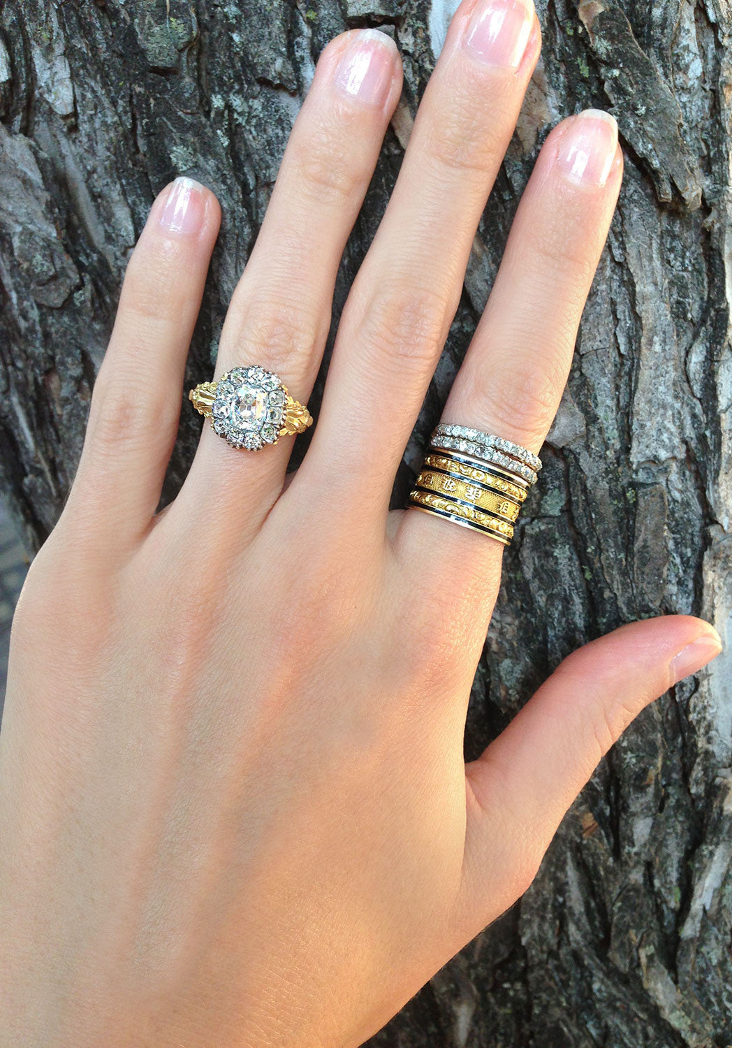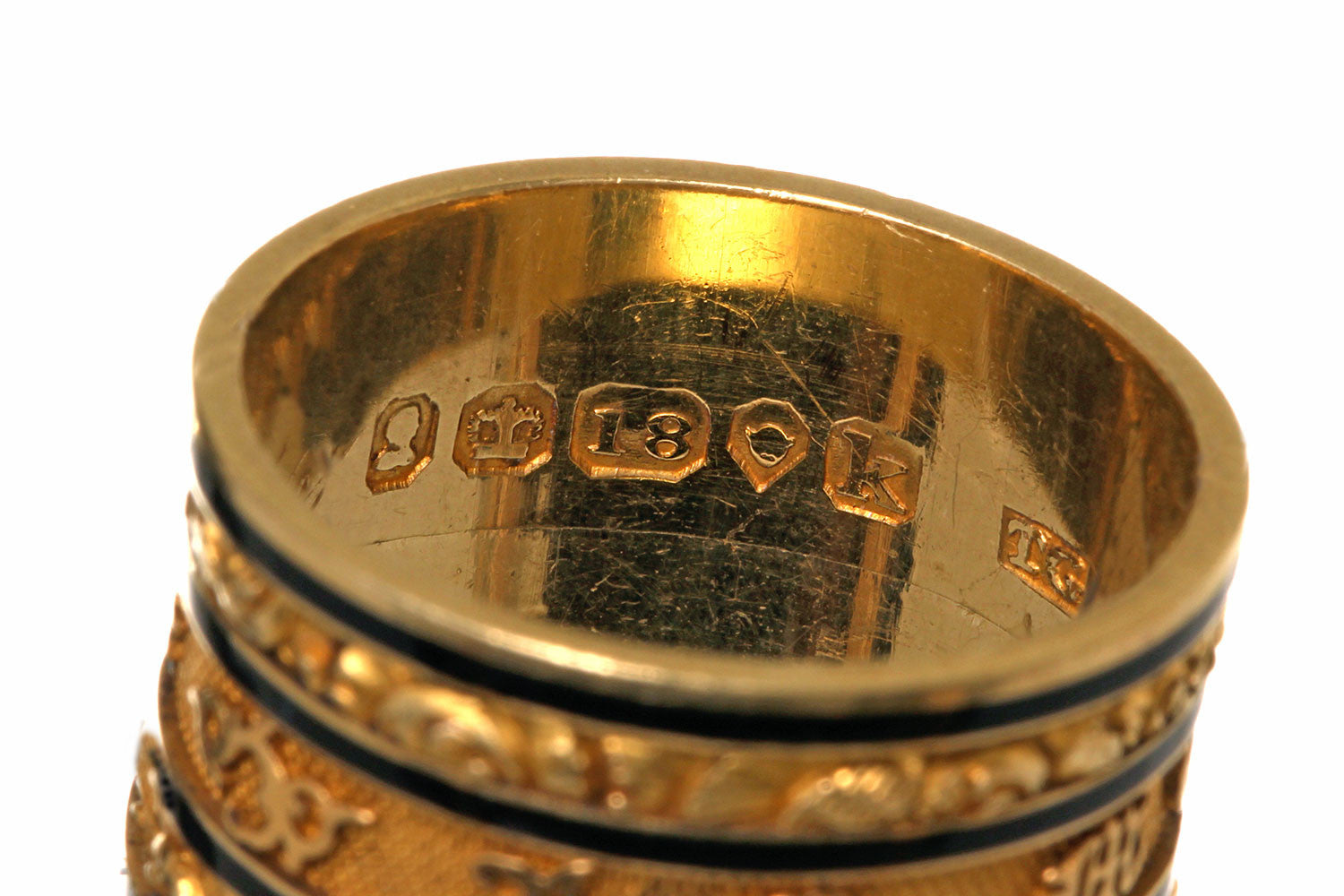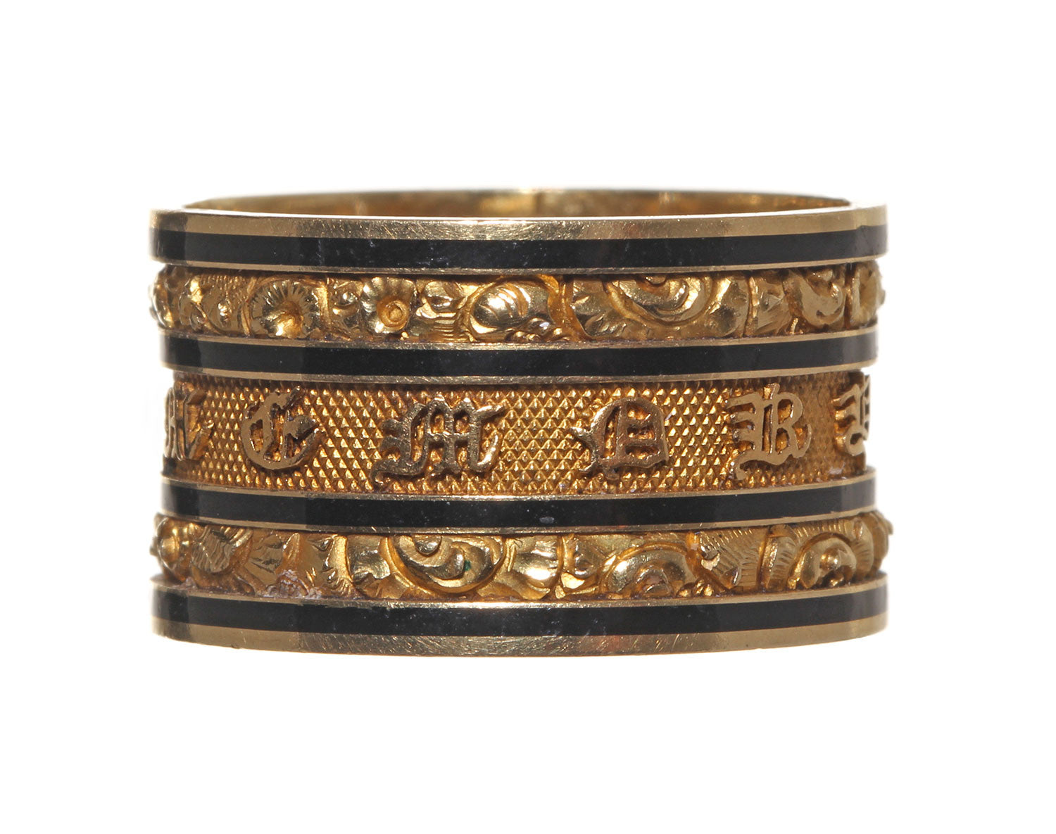 An example of an exceptionally wide mourning ring from the early 19th Century. It reads 'In Memory Of" in olde english type on the exterior of the ring. With additional engraving on the interior. These rings were bequeathed to loved ones in the deceased estate. We have another ring from the same estate that was made for another family member. English hallmarks indicate the ring was made in London in 1826. 18k Gold & black enamel.